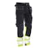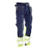 Rymliga hölsterfickor med extrafack och förstärkt insida. Påsydda förstärkta framfickor som hölsterfickorna kan stoppas ned i. Hammarhank. Bakfickor med förstärkt insida. Benficka med telefonfack och ID-kortsfack. Förböjda knän för optimal passform. Knäskyddsfickor i slitstark polyamid med två höjdnivåer för knäskydden. Fluorescerande tyg och reflexer på benen. Benslut i polyamid förhindrar att fukt sugs upp.