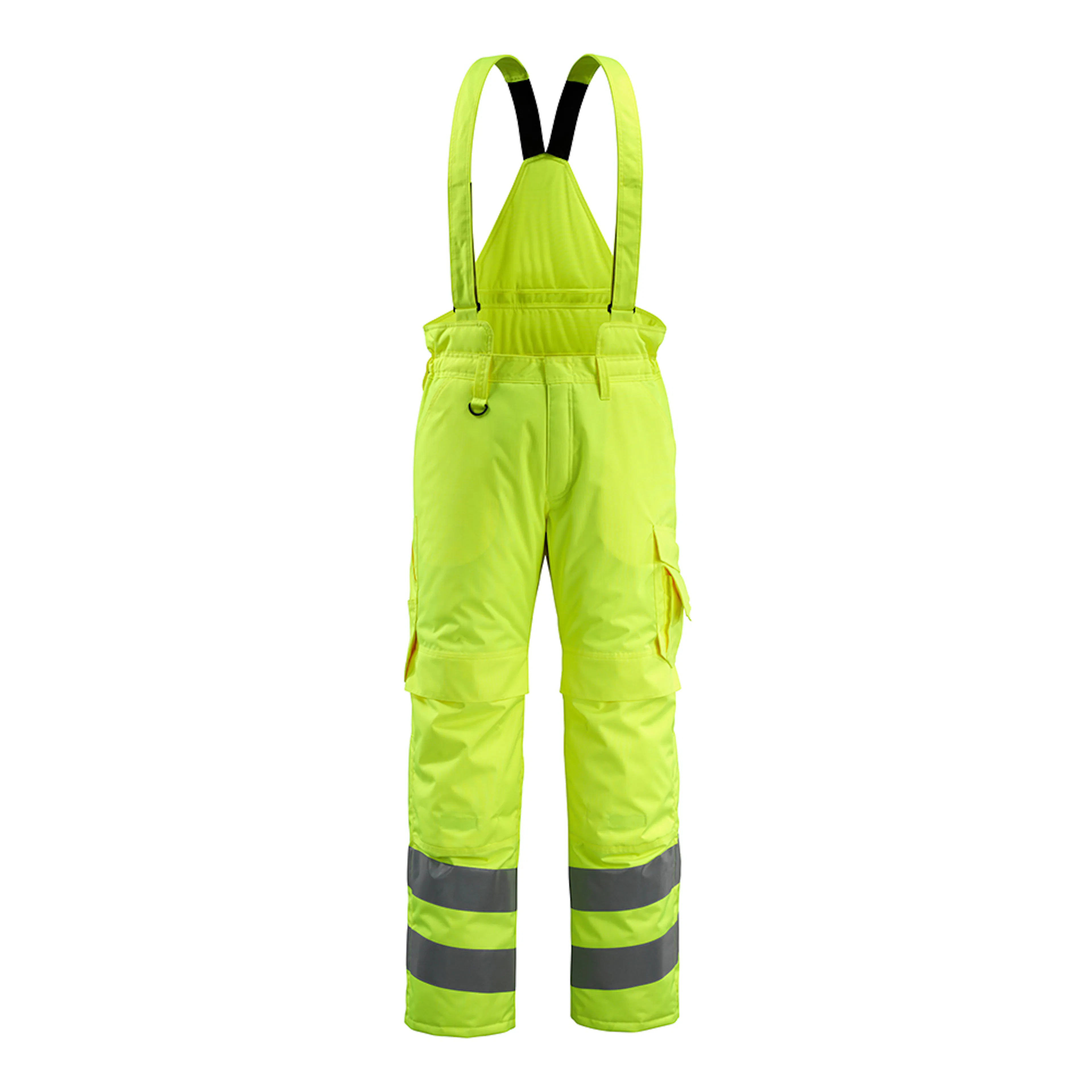 Fluorescerande med sneda tvärgående reflexer. Andas, vind- och vattentät. Sömmarna är tejpade. Quiltfoder. Bältesstroppar. D-ring. Gylf med blixtlås. Fickor på framstycket. Bakfickor med förstärkningar, lock och dolda tryckknappar. Benficka med förstärkningar och extra fickor – en invändig telefonficka samt en utvändig telefonficka med lock och magnetknäppning. Tumstocksficka. Knäfickorna är justerbara och har lock öppning upptill. Snölås invändigt i benen. Blixtlås med vindskydd på yttersidan av benen. Vi rekommenderar 00718-100, 00418-100, 50454-916 & 20118-915 knäskydd till den här modellen. Samcertifierade med knäskyddstyp SHORT eller LONG enligt EN 14404.