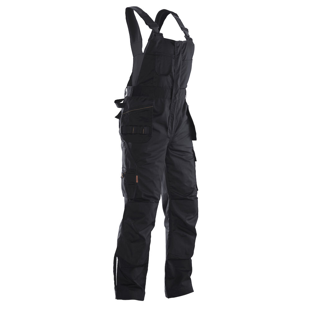 Lättskött polyester/bomull som håller färg och form. Bröstfickor, den högra med ficklock och kardborrestängning. Hängslen med resår. Hölsterfickor med extra fack och extra ficka med blixtlås. Bakfickor med lock och kardborrestängning. Benficka med extra fack och lock med kardborrestängning. Tumstocksficka med knivhållare. Förstärkning på knäskyddsfickor. C42-64 kan förlängas med 5 cm genom ett utvik i benslutet.