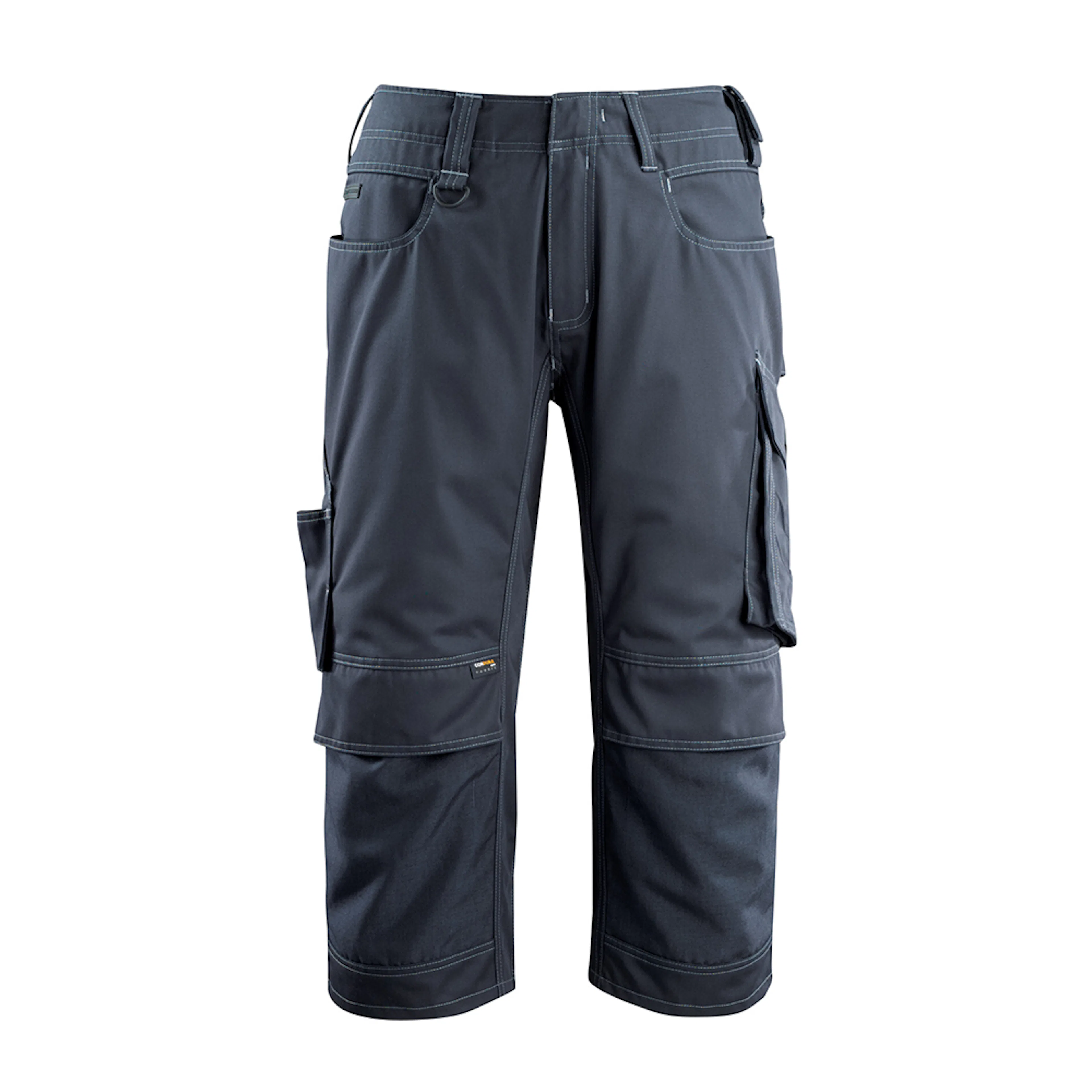Slitstarka trenålssömmar på ben och i skrev förlänger produktens livslängd. Utmärkt passform med formskurna ben och kilar på insidan av ben och skrev (med extra förstärkning). Sned, rymlig benficka med lättillgänglig telefonficka. Av slitstark CORDURA® – med öppning för knäskydd från ovansidan och med lucka så att inte smuts samlas. Knäfickorna kan justeras så att knäskydden är placerade optimalt i förhållande till dina knän. Samcertifierade för användning med MASCOT:s knäskyddstyp, SHORT.