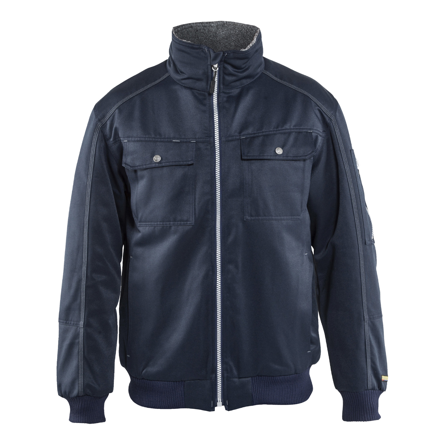Varmfodrad jacka från Blåkläder i pilotmodell i vatten- och smutsavvisande ytatyg. Jackan har förböjda armar, bälg i rygg, metallknappar och hög krage. Ribbstickad mudd i midja och ärmslut.