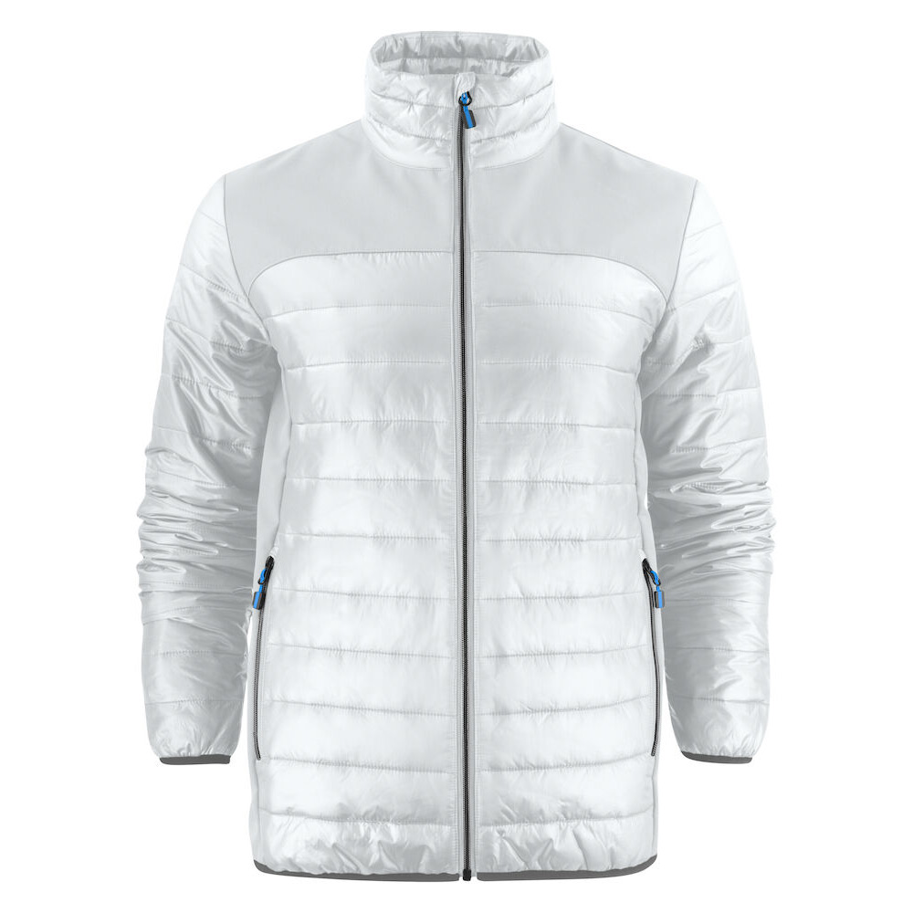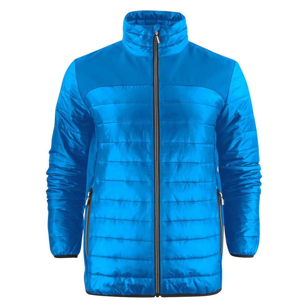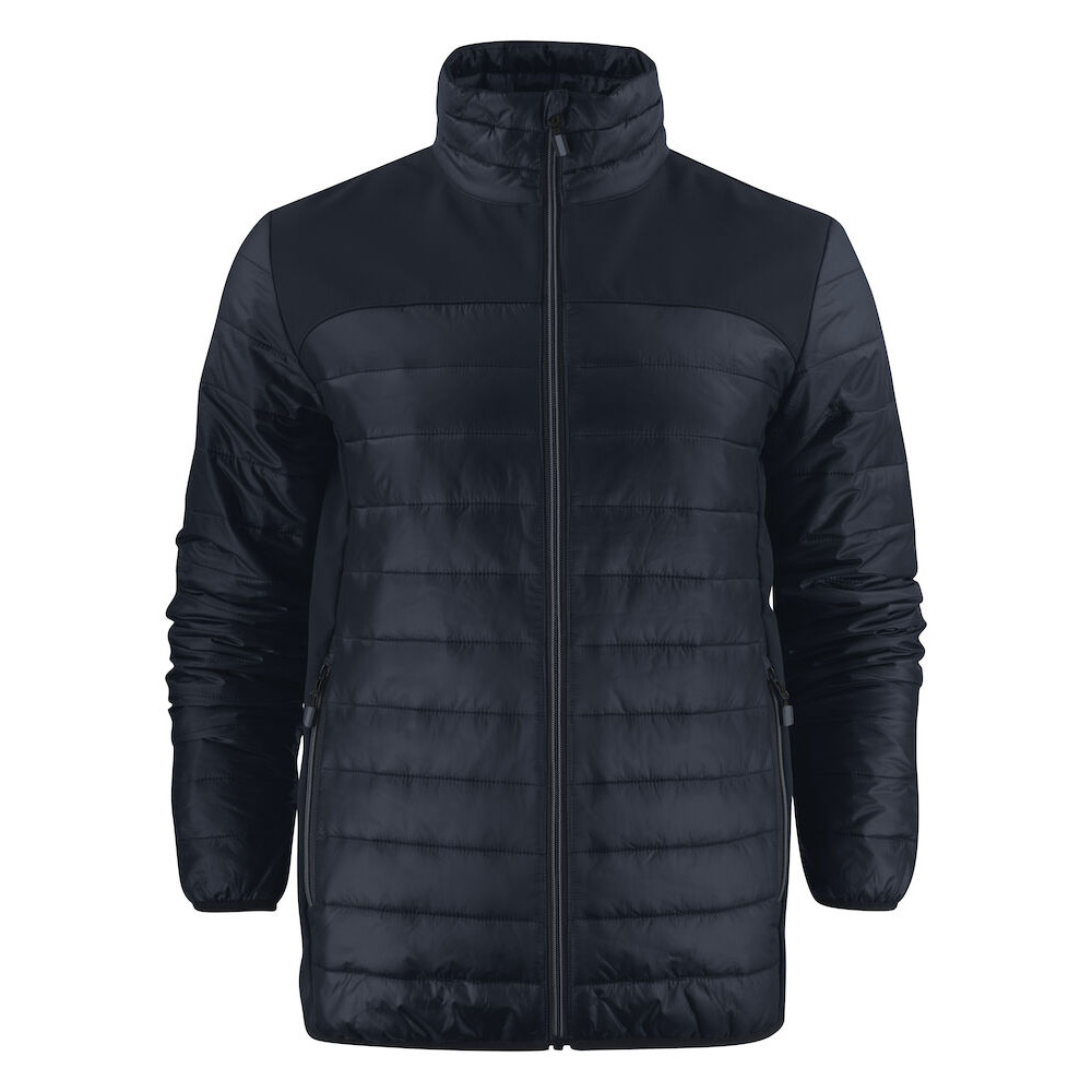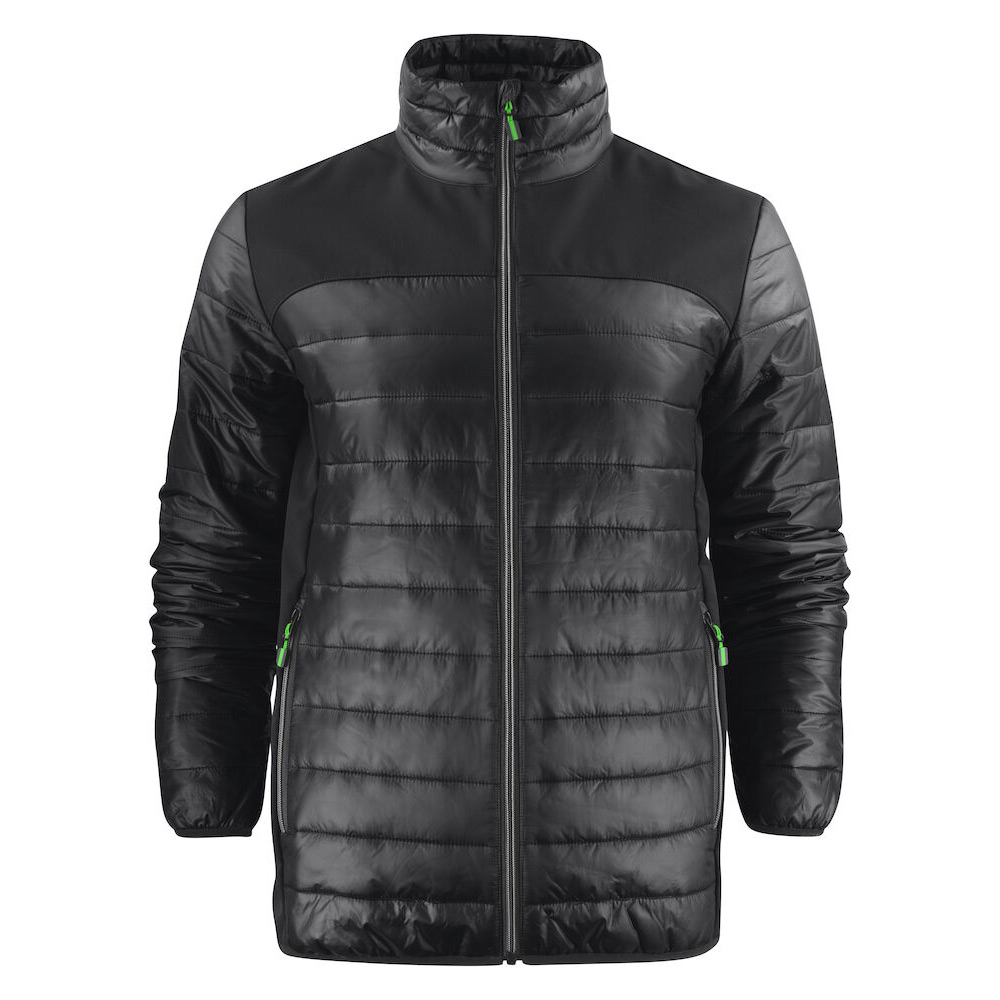 Softshell/lättviktsjacka med ok och sidopaneler i softshell (tyg 1). Bål och ärmar av vadderat, lättviktsmaterial (tyg 2). Blixtlås och zip pullers i Printer Essentials-manér.