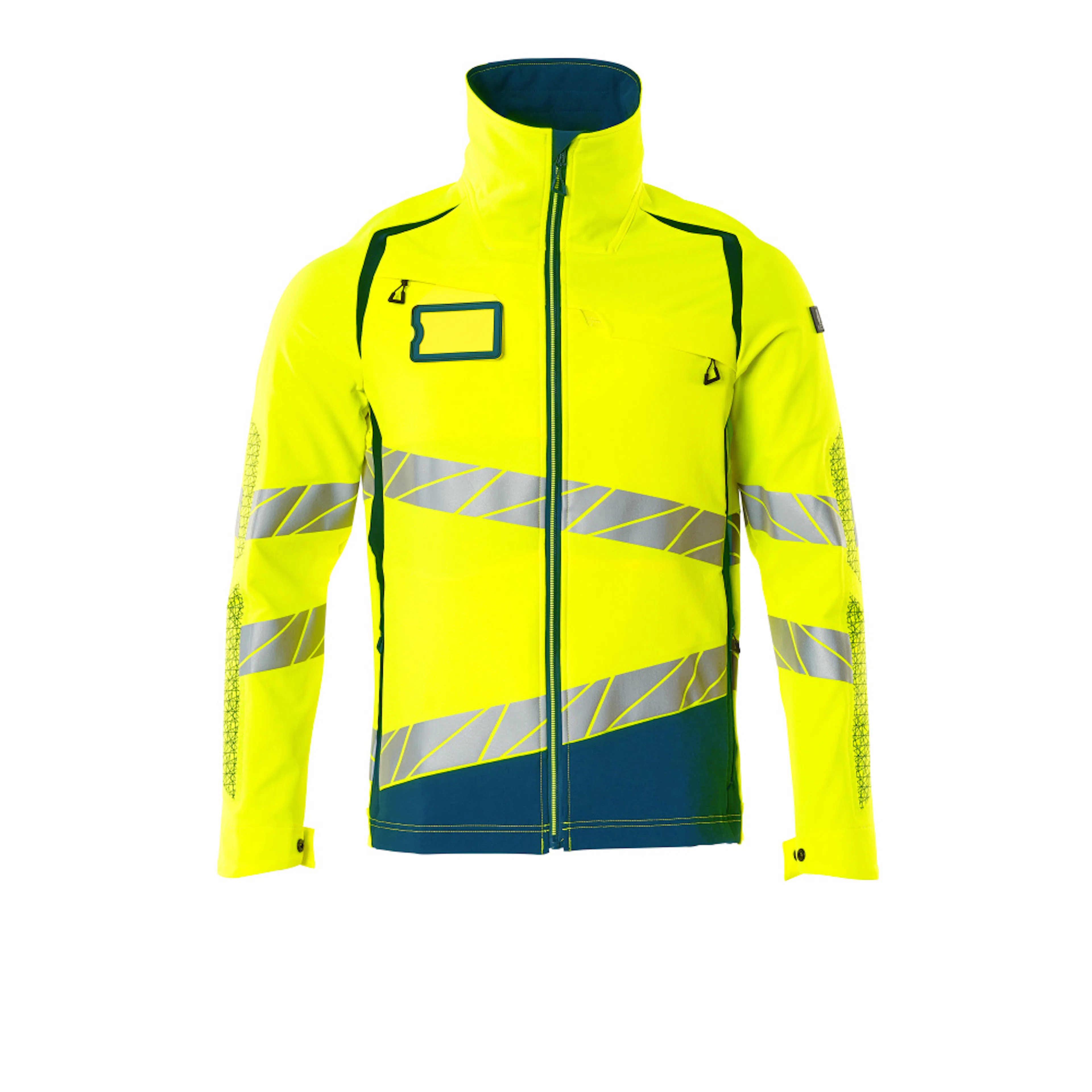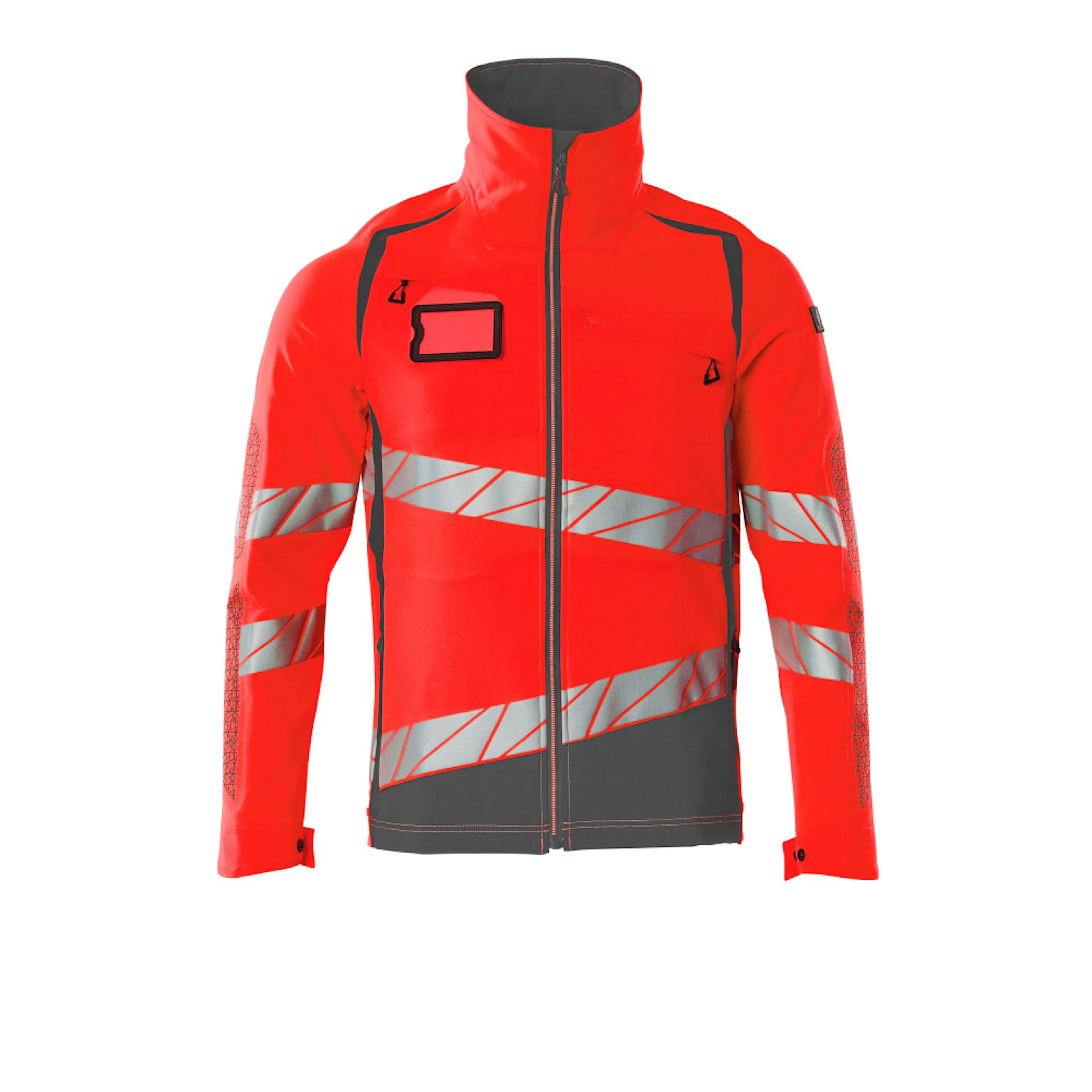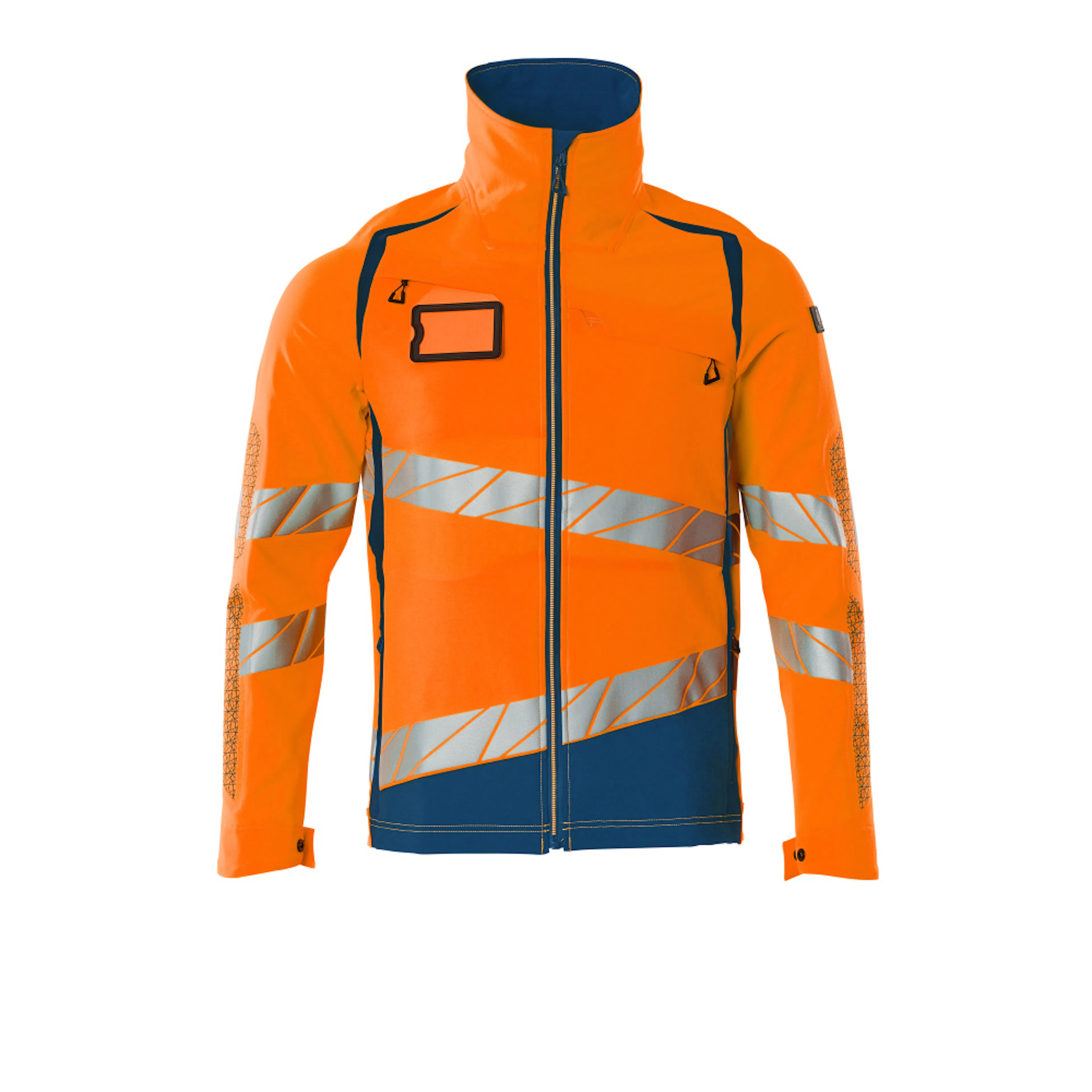 Fluorescerande med sneda tvärgående reflexer. Har en vattenavvisande yta. Ultimate stretchtyg med låg vikt och bra slitstyrka. Hög krage. Tvåfärgat. Stängning med blixtlås och invändigt vindfång. Förberedd för montering av ID-kort. Bröstficka med blixtlås. Framfickor med blixtlås. Innerfickor. Resår i sidorna och nederkanten. Resår vid handleden. Ventilation under ärmarna. Med tryckeffekter.