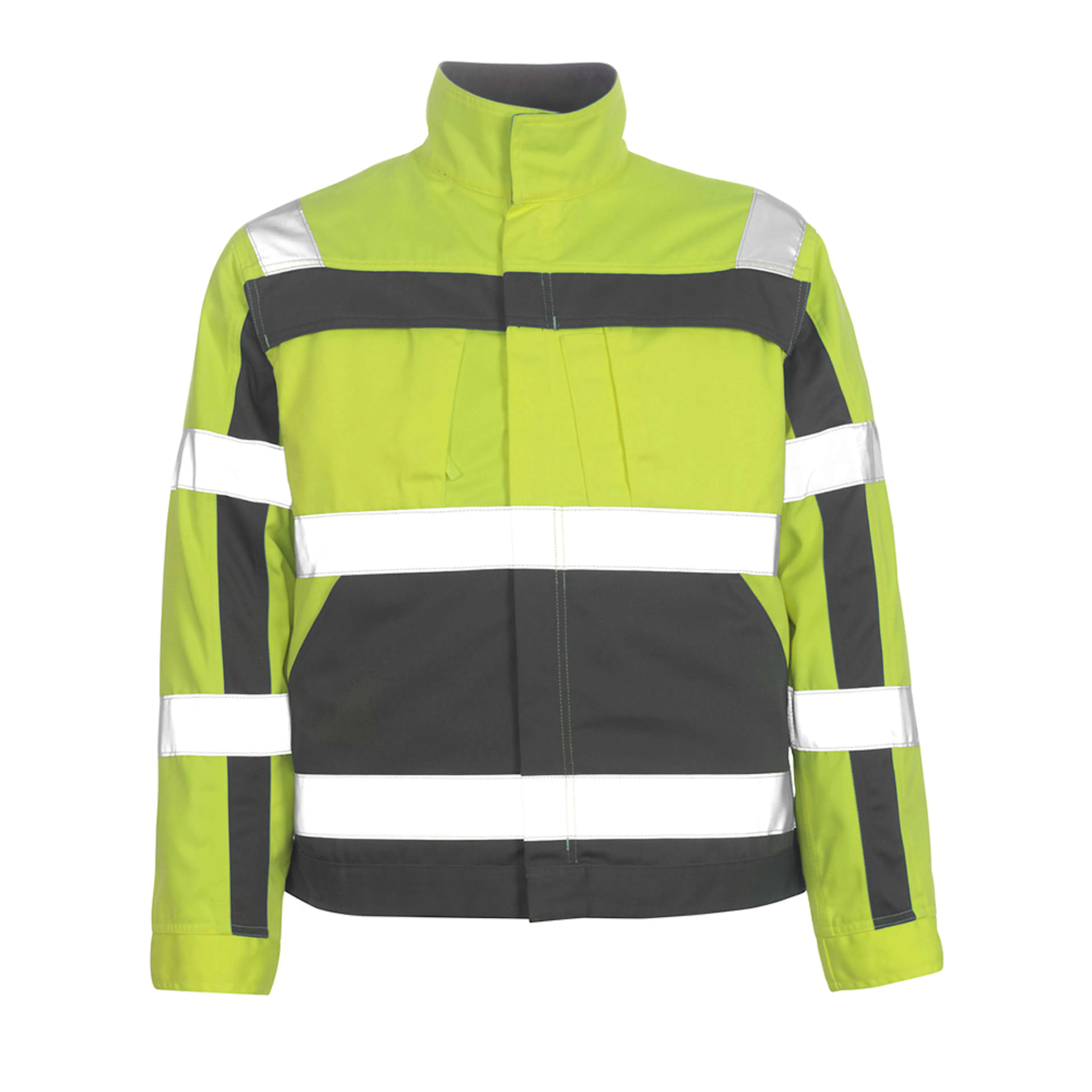 Fluorescerande och med lod- och vågräta reflexer. Teflon® gör produkten smutsavvisande. Tvåfärgat. Hög krage med tryckknappar. Trenålsstickningar på ärmar och i sidan. Stängning med blixtlås och vindskydd med tryckknappar. Bröstfickor med lock och kardborreband. Telefonbröstficka med blixtlås. D-ring. Pennficka. Fickor på framstycket. Innerficka med blixtlås. Linning med tryckknappjustering. Manschetter med tryckknappsjustering.