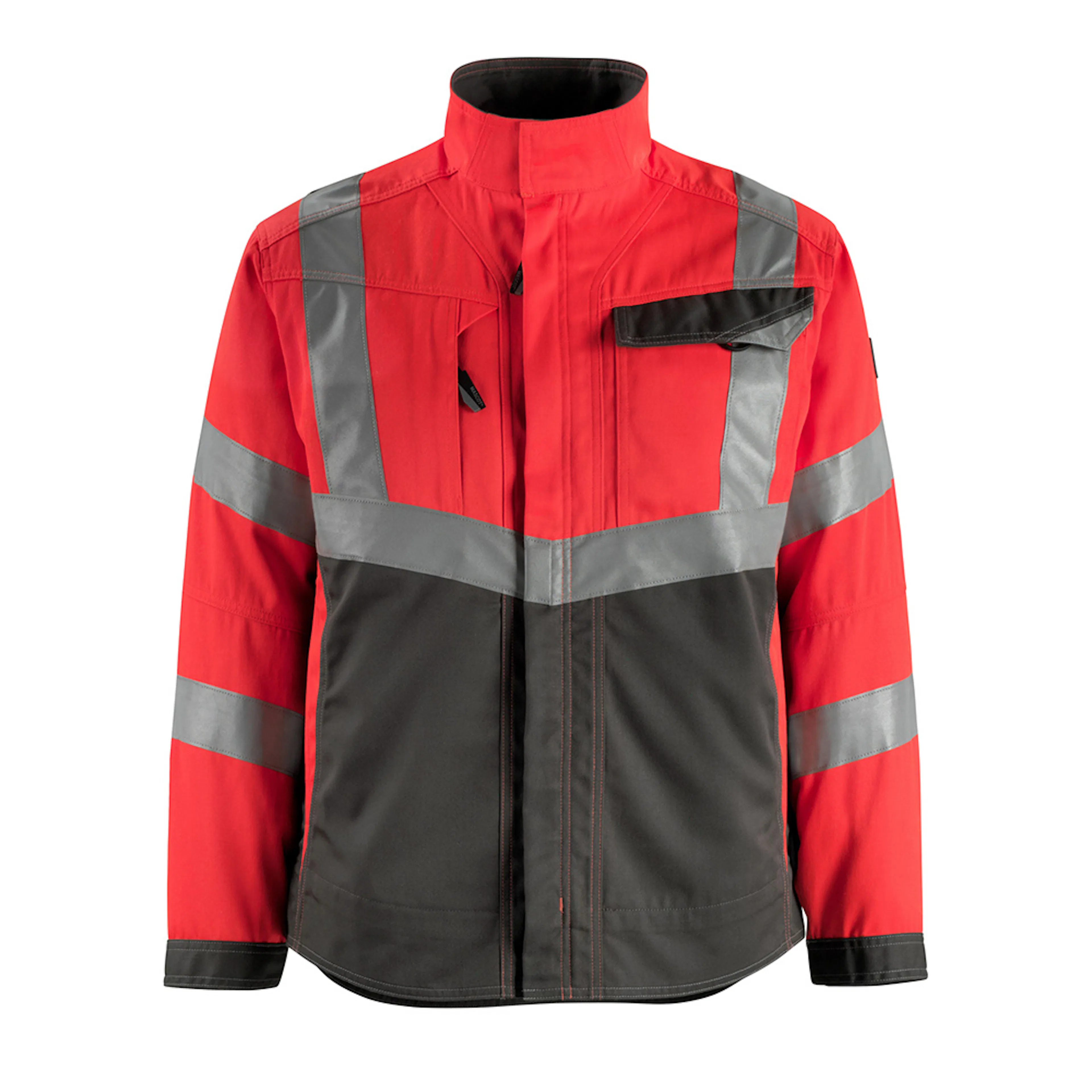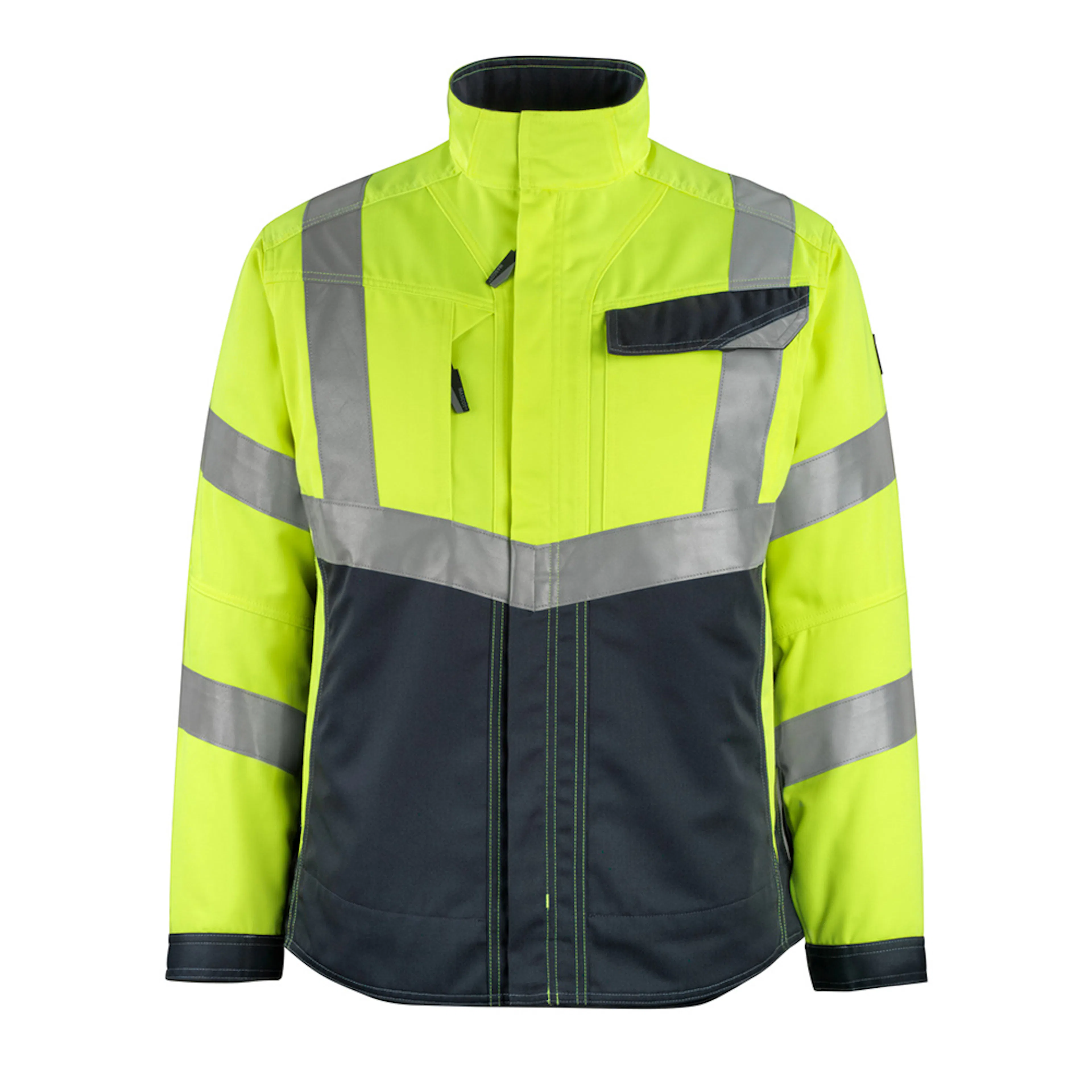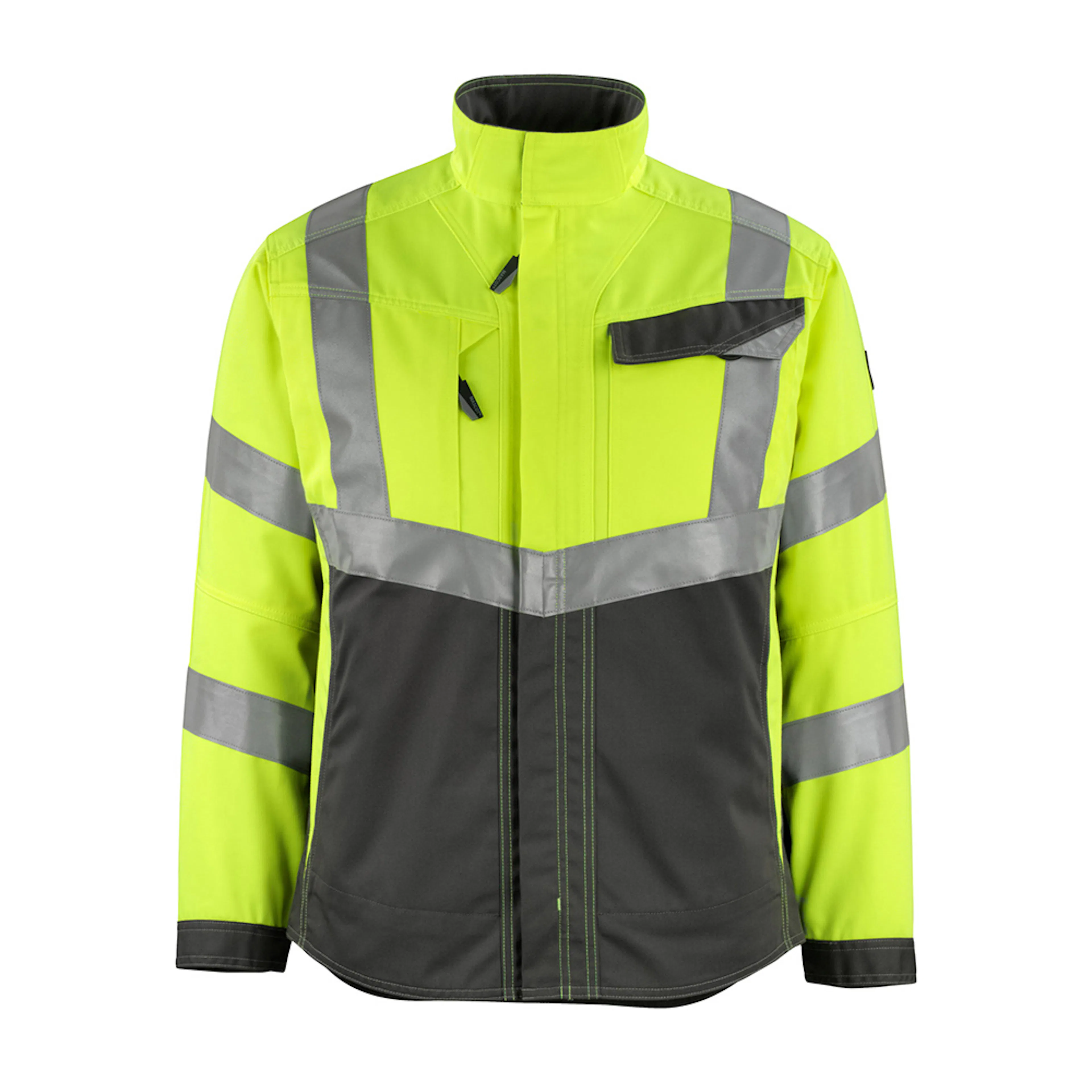 Fluorescerande med lodräta och sneda tvärgående reflexer. Tvåfärgat. Teflon® gör produkten smutsavvisande. Hög krage. Tvånålsstickning på skuldra och i sidan. Stängning med blixtlås och vindskydd med tryckknappar. Ryggen är förlängd. Bröstficka med blixtlås. Bröstficka med lock och tryckknapp. D-ring. Ergonomiskt utformade ärmar ger god rörelsefrihet. Fickor på framstycket. Innerfickor. Ventilation under ärmarna. Linning med tryckknappjustering. Manchetter med tryckknappar.