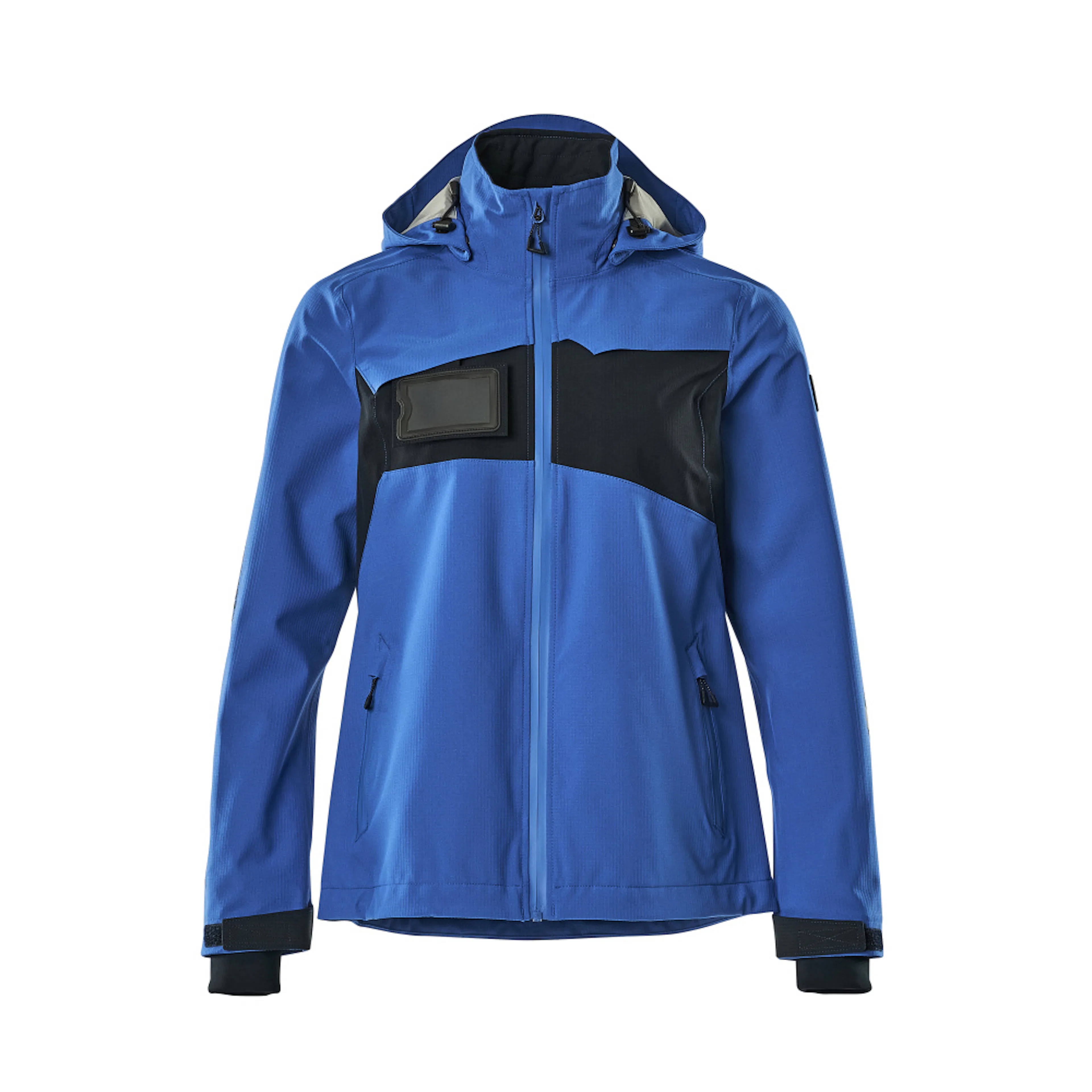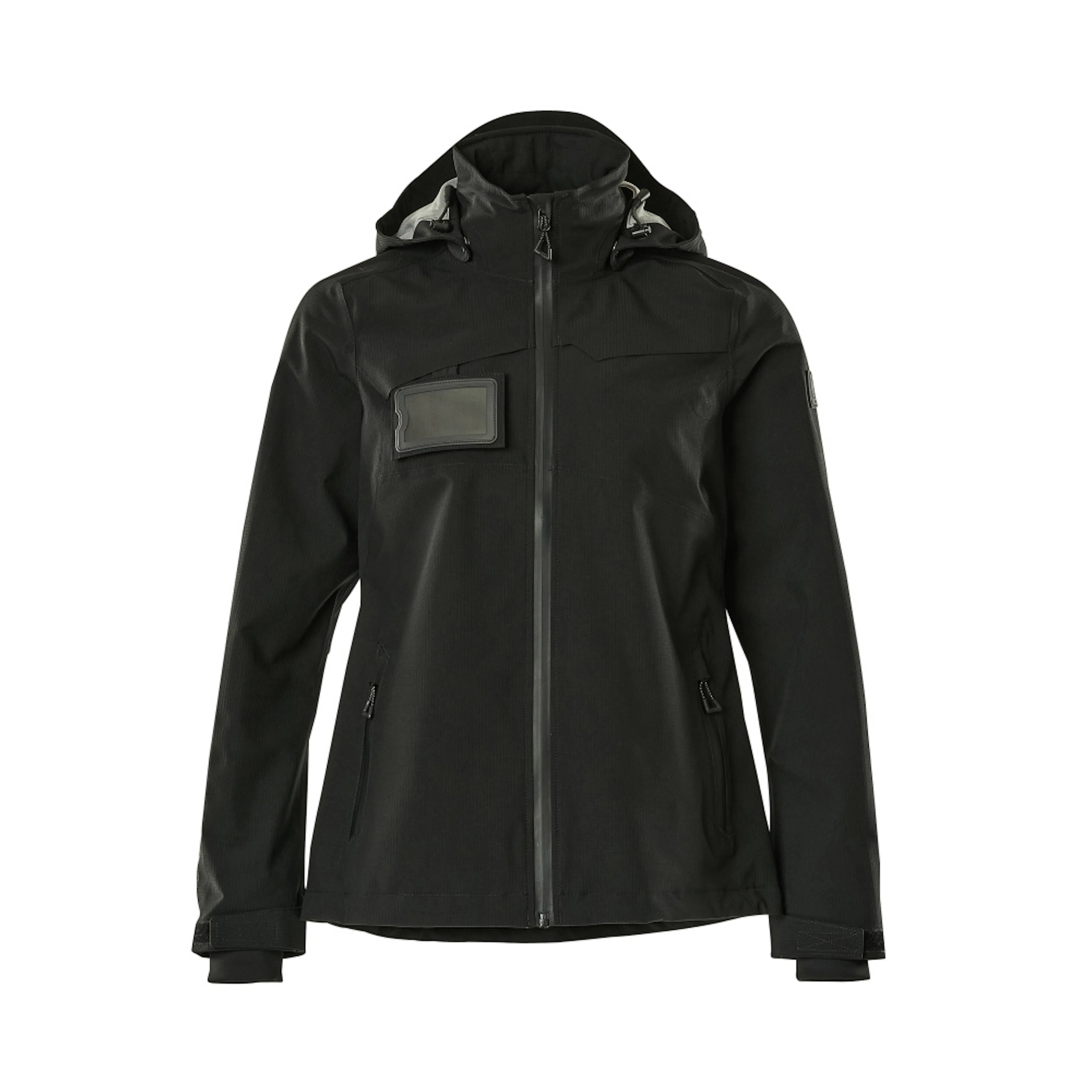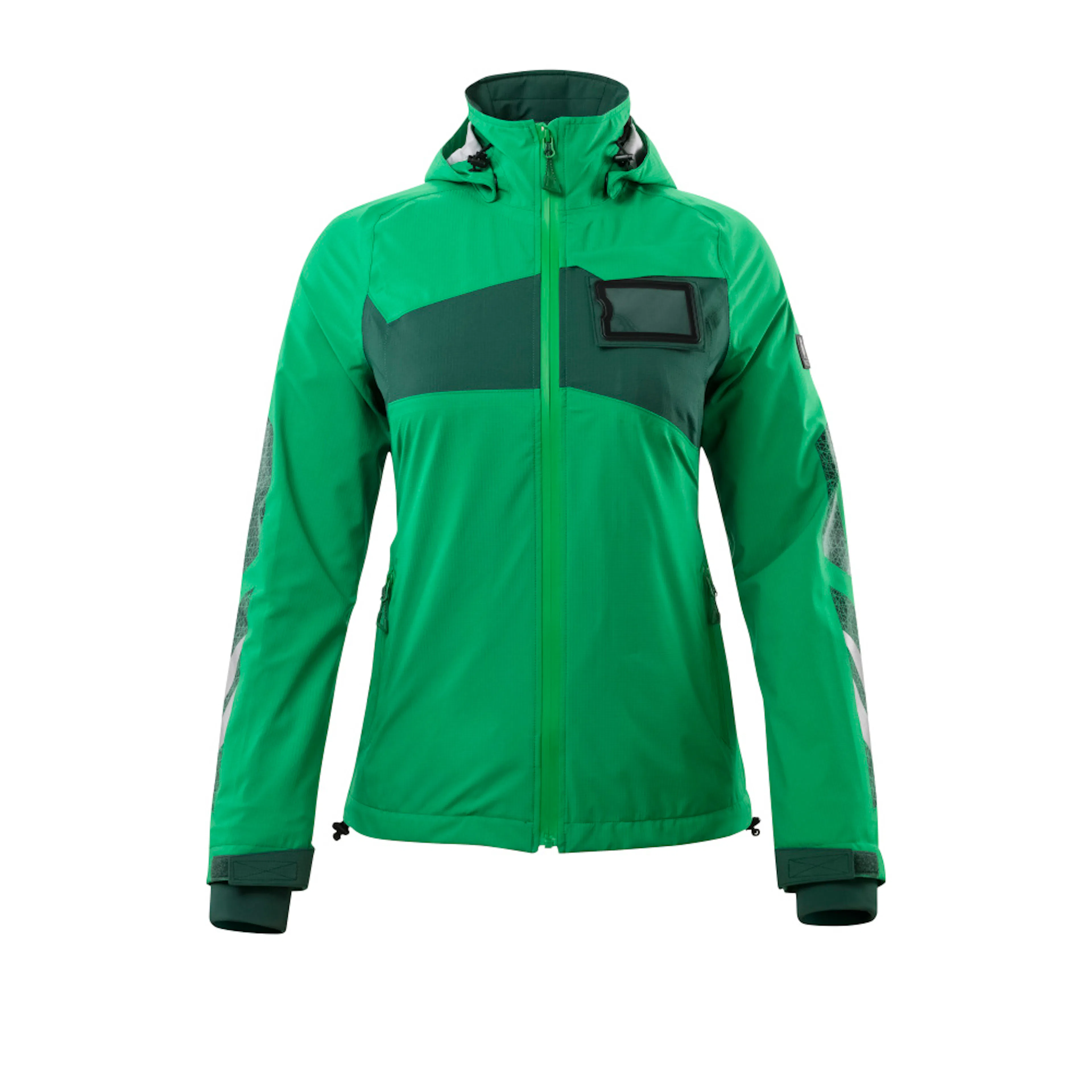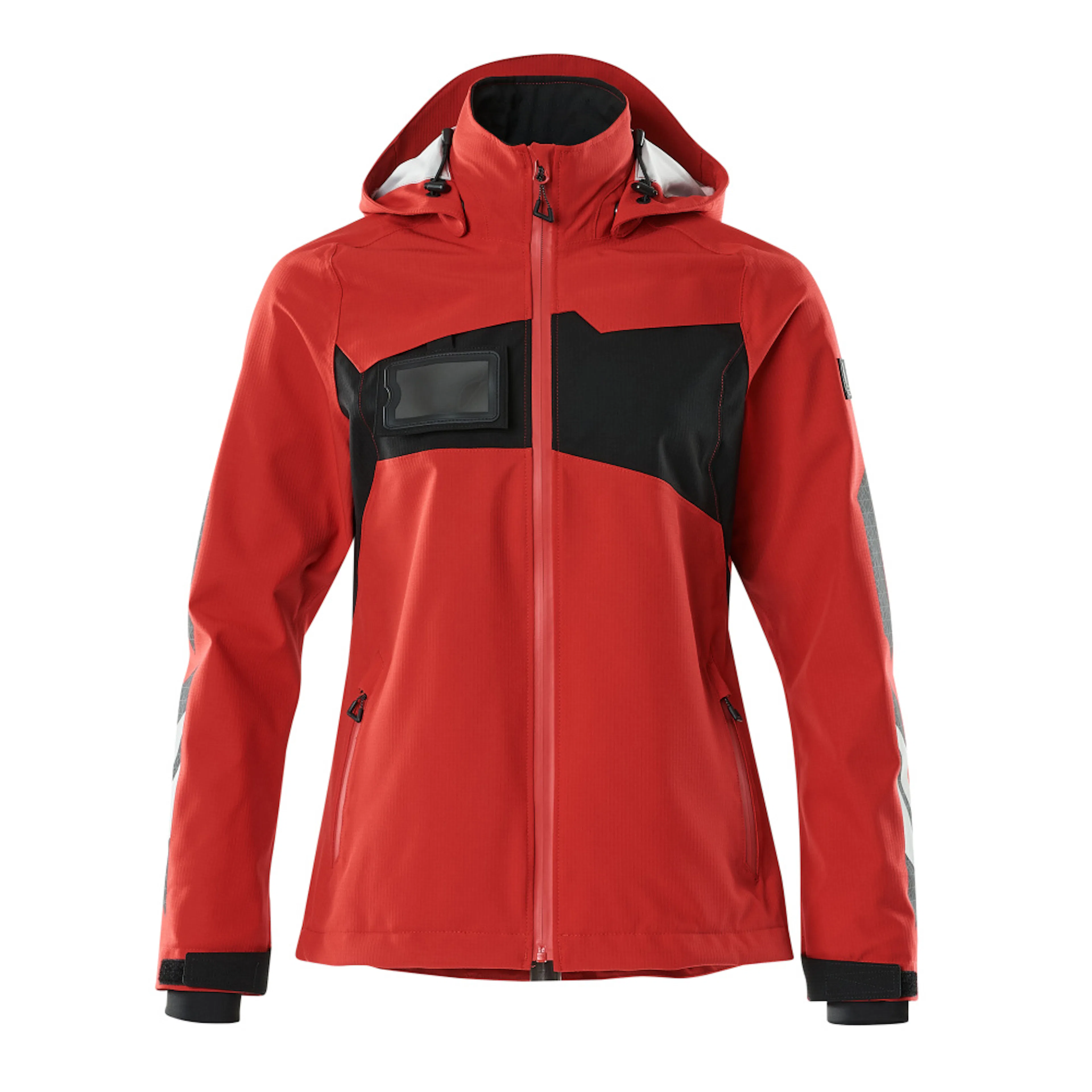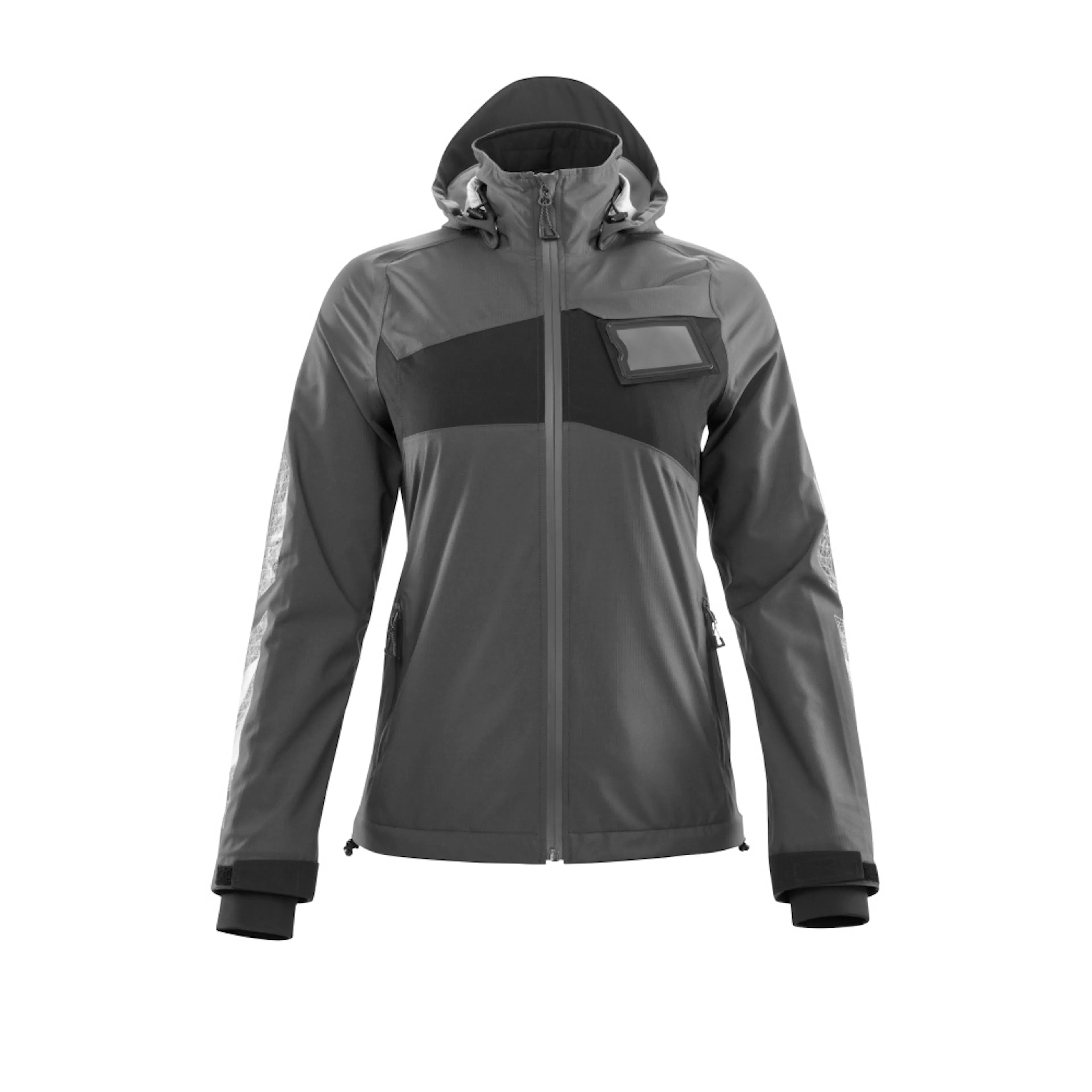 Lady passform. Metervaran är lätt. Vindtätt och vattenavvisande. Sömmarna är tejpade. Huvan är avtagbar, fodret har justerbart resårsnöre. Stängning med blixtlås och invändigt vindfång. Innerficka med blixtlås. ID-kortshållaren är avtagbar. Framfickor med blixtlås. Resårkanten i nederkanten är reglerbar. Ribbstickning vid handleden (dold i vindskyddet). Med tryck och reflexer.