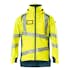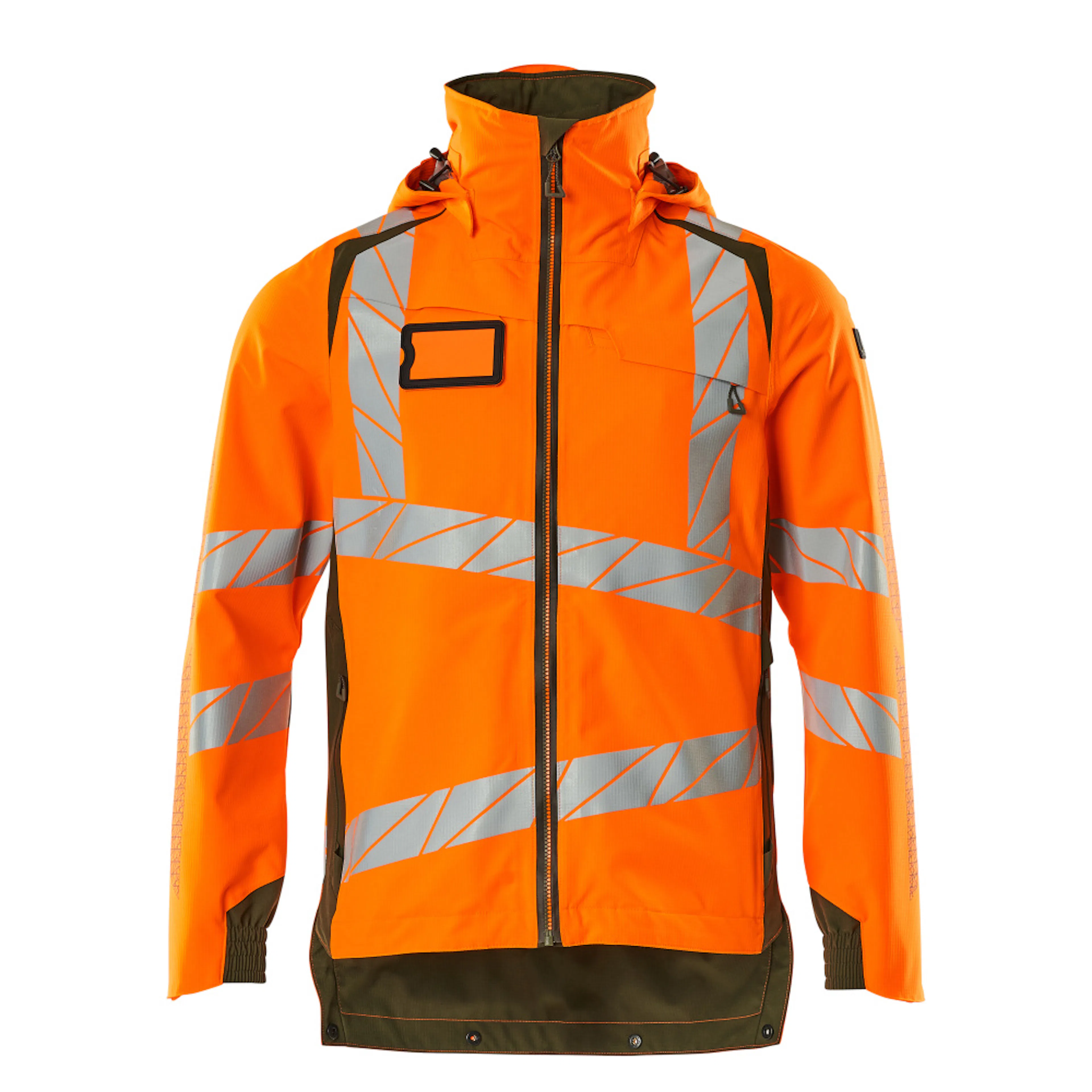 Fluorescerande med lodräta och sneda tvärgående reflexer. Tvåfärgat. Hög andningsbarhet samt vind- och vattentät. Sömmarna är tejpade. Huvan är avtagbar, fodret har justerbart resårsnöre. Reglerbar metalltråd i båda sidorna av huvan. Stängning med vattentätt blixtlås och invändigt vindfång. Innerfickor - två med blixtlås och en öppen nätficka. ID-kortshållaren är avtagbar. Bröstficka med vattentätt blixtlås. Framfickor med vattentäta blixtlås. Hög krage. Ribbstickning i nedre kanten på framsidan av jackan. Extra tyg nederst på ryggen kan vikas ned med knappar och ge extra längd baktill och därmed extra skydd mot väder och vind. Ribbstickning vid handleden (dold i vindskyddet). Resår vid handleden. Med tryckeffekter.