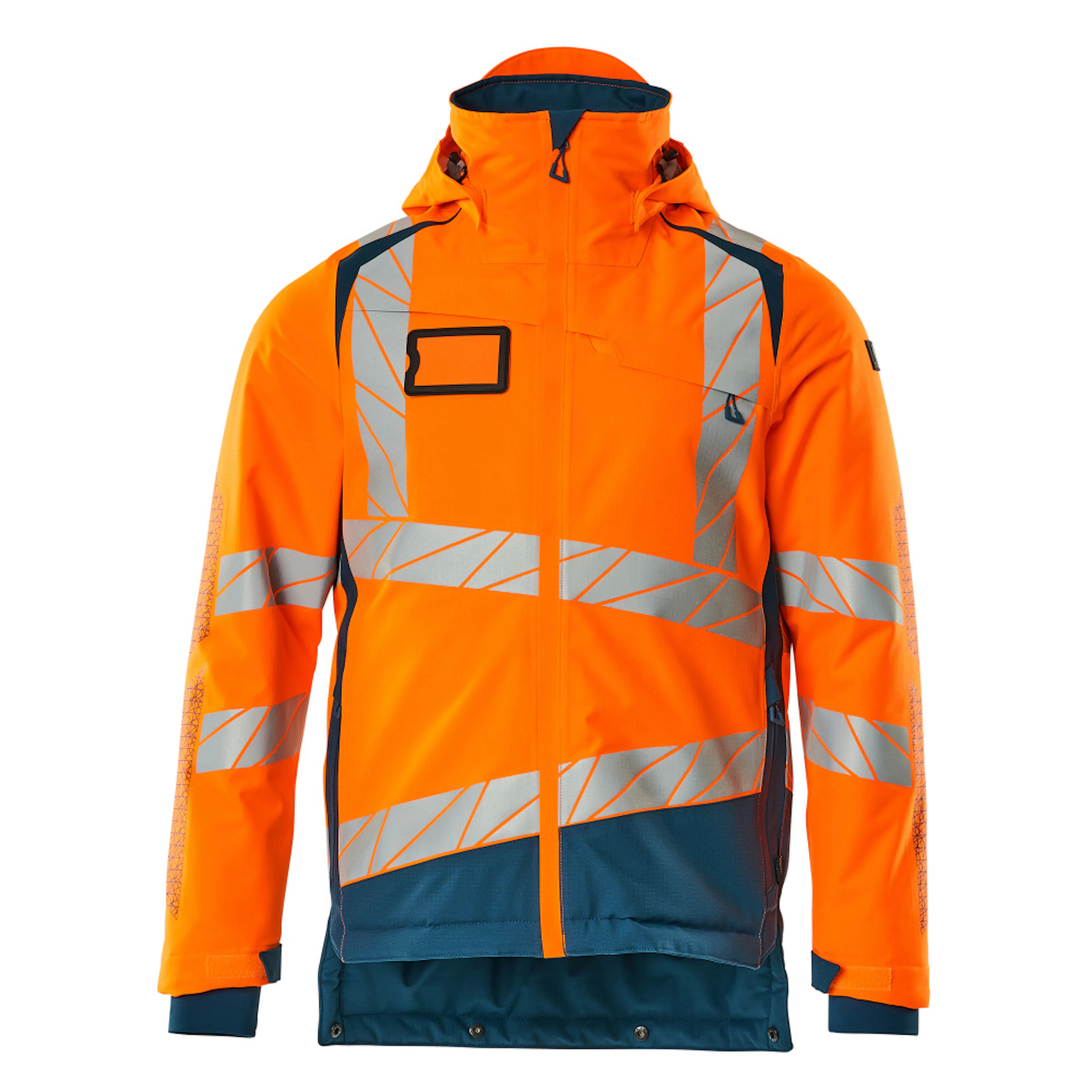 Fluorescerande med lodräta och sneda tvärgående reflexer. Metervara med hög slitstyrka, andas, vind- och vattentät. Med CLIMASCOT® Lightweight Insulation. Tvåfärgat. Sömmarna är tejpade. Huvan är avtagbar, fodret har justerbart resårsnöre. Stängning med vattentätt blixtlås och invändigt vindfång. Innerfickor - två med blixtlås och en öppen nätficka. ID-kortshållaren är avtagbar. Bröstficka med vattentätt blixtlås. Framfickor med vattentäta blixtlås. Hög krage. Ribbstickning i nedre kanten på framsidan av jackan. Extra tyg nederst på ryggen kan vikas ned med knappar och ge extra längd baktill och därmed extra skydd mot väder och vind. Ribbstickning vid handleden (dold i vindskyddet). Kardborreband vid handleden. Blixtlås nederst på ryggen, invändigt, för användning vid tryck/broderi. Med tryckeffekter.