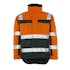 Fluorescerande och med lod- och vågräta reflexer. Tvåfärgat. Andas, vind- och vattentät. Sömmarna är tejpade. Pälsfoder på fram- och bakstycke. Quiltfoder i ärmarna. Ryggen är förlängd. Stängning med blixtlås, vindskydd och dolda tryckknappar. Blixtlåsficka under vindskydd. Bröstfickor med lock och kardborreband. Telefonbröstficka med blixtlås. D-ring. Pennficka. Fickor på framstycket. Innerficka med kardborreband. Ribbstickning (dold i vindskyddet) och tryckknappar vid handleden. Tryckknappar i nederkanten. Blixtlås nederst på ryggen, invändigt, för användning vid tryck/broderi. Tryckknappar till huva.