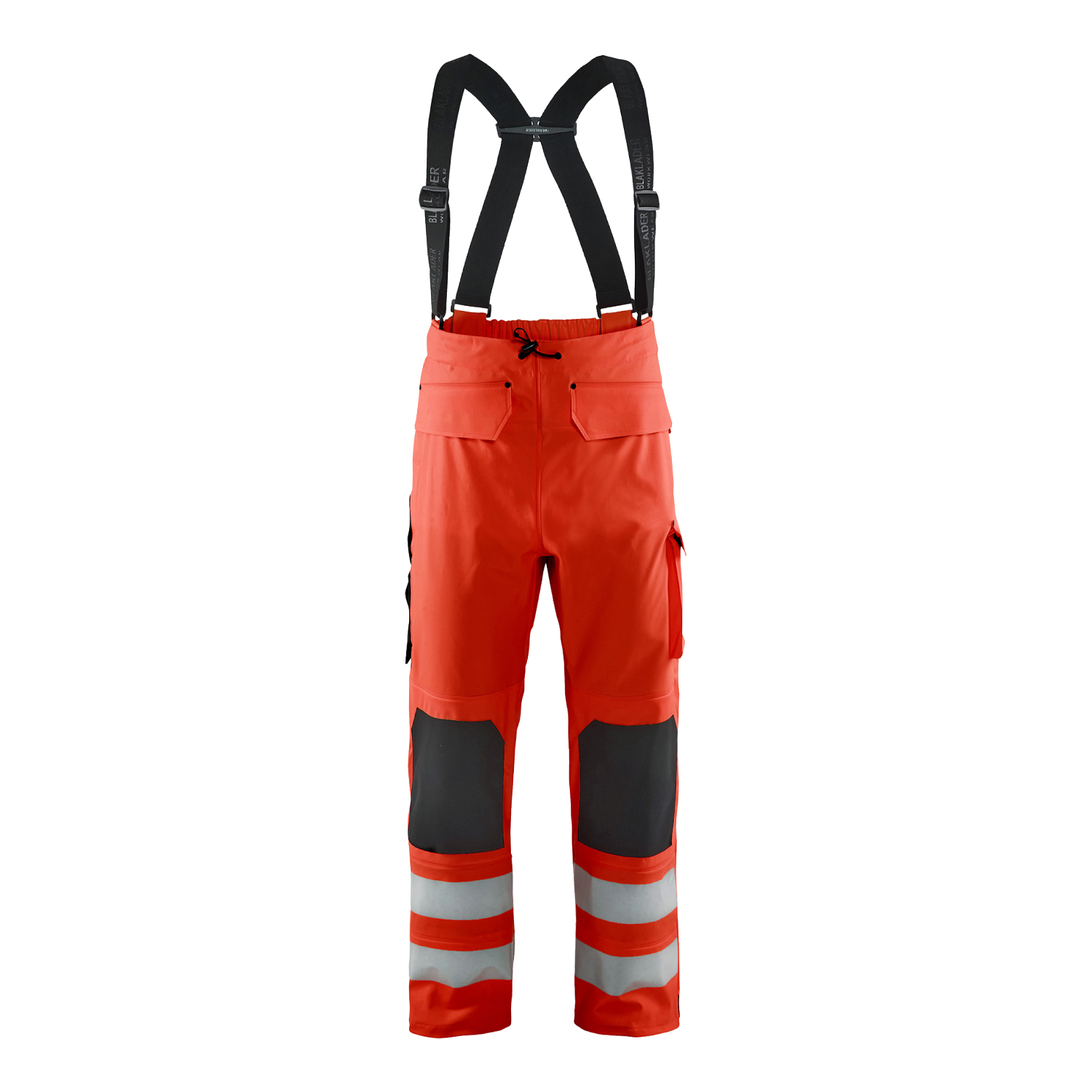 Regnbyxa från Blåkläder i varsel för dig med arbetsuppgifter som kräver ett slitstarkt men samtidigt rörligt regnplagg. Byxan är vind- och vattentät med svetsade sömmar. Bra passform med bred resår bak, justerbara och avtagbara resårhängslen samt justerbara benavslut med knappar.