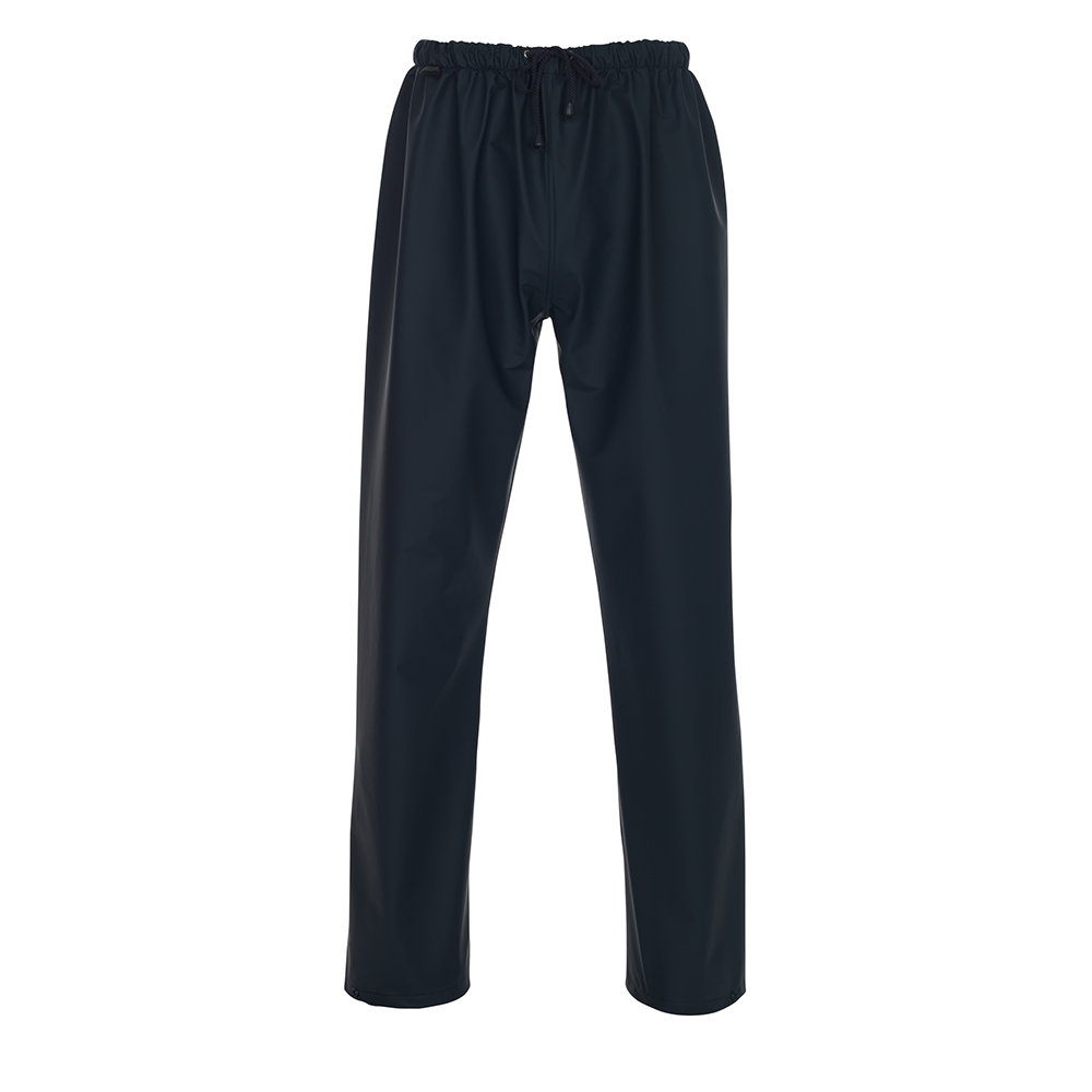 Vind- och vattentätt. Det vattentäta materialet har svetsade sömmar så att regnet inte kan tränga in. Resår och snörning i midjan. Tryckknappsjustering vid foten.