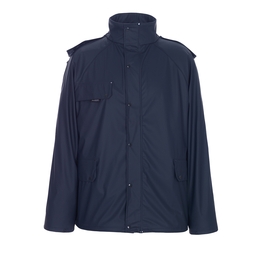 Vind- och vattentät. Sömmarna är svetsade. Huva dold i kragen. Stängning med blixtlås och vindskydd med tryckknappar. Bröstficka med lock och tryckknapp. Framfickor med lock och tryckknappar. Ventilation i ryggen. Resårkanten i nederkanten är reglerbar. Tryckknappsjustering vid handleden.