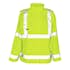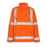Vind- och vattentät. Fluorescerande och med lod- och vågräta reflexer. Sömmarna är svetsade. Huva med snöre som är dold i kragen. Stängning med blixtlås och vindskydd med tryckknappar. Bröstficka med lock och tryckknapp. Framfickor med lock och tryckknappar. Ventilation i ryggen. Resårkanten i nederkanten är reglerbar. Tryckknappsjustering vid handleden.