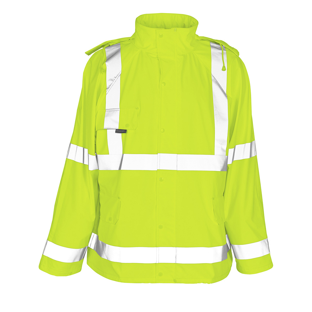 Vind- och vattentätt. Det vattentäta materialet har svetsade sömmar så att regnet inte kan tränga in. Extra synlighet med både lodrätta och vattentäta reflexer. Huvan kan vikas in i kragen och har justerbara elastiska snören. Ventilation i ryggen.