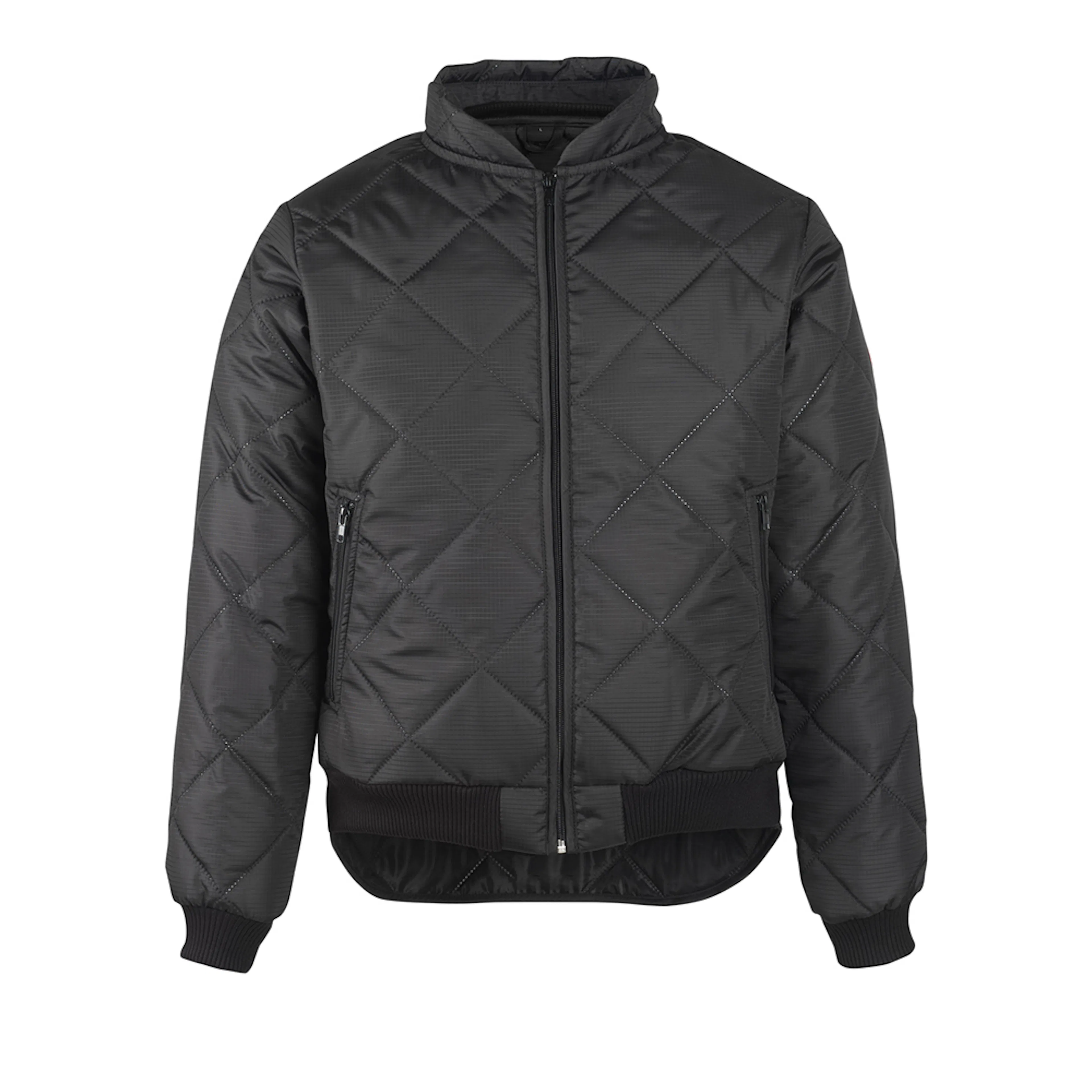 Ultraljudssvetsad kvilt med polyestervadd är mycket isolerande och mer hållbart än sydd kvilt. Lätt böjd krage med ribbad insida, som ligger tätt intill halsen och håller kylan ute. Framfickor med blixtlås för säker förvaring. Extra skydd mot kyla genom förlängd rygg. Ribbstickning i nederkant och vid handleder.