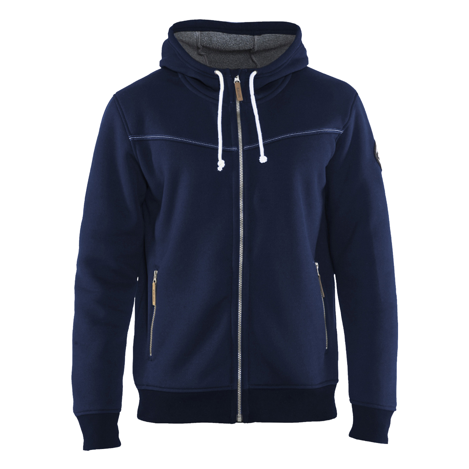 Huvtröja från Blåkläder med påsytt märke på ärmen, invändig slå med fleece och framfickor med blixtlås.