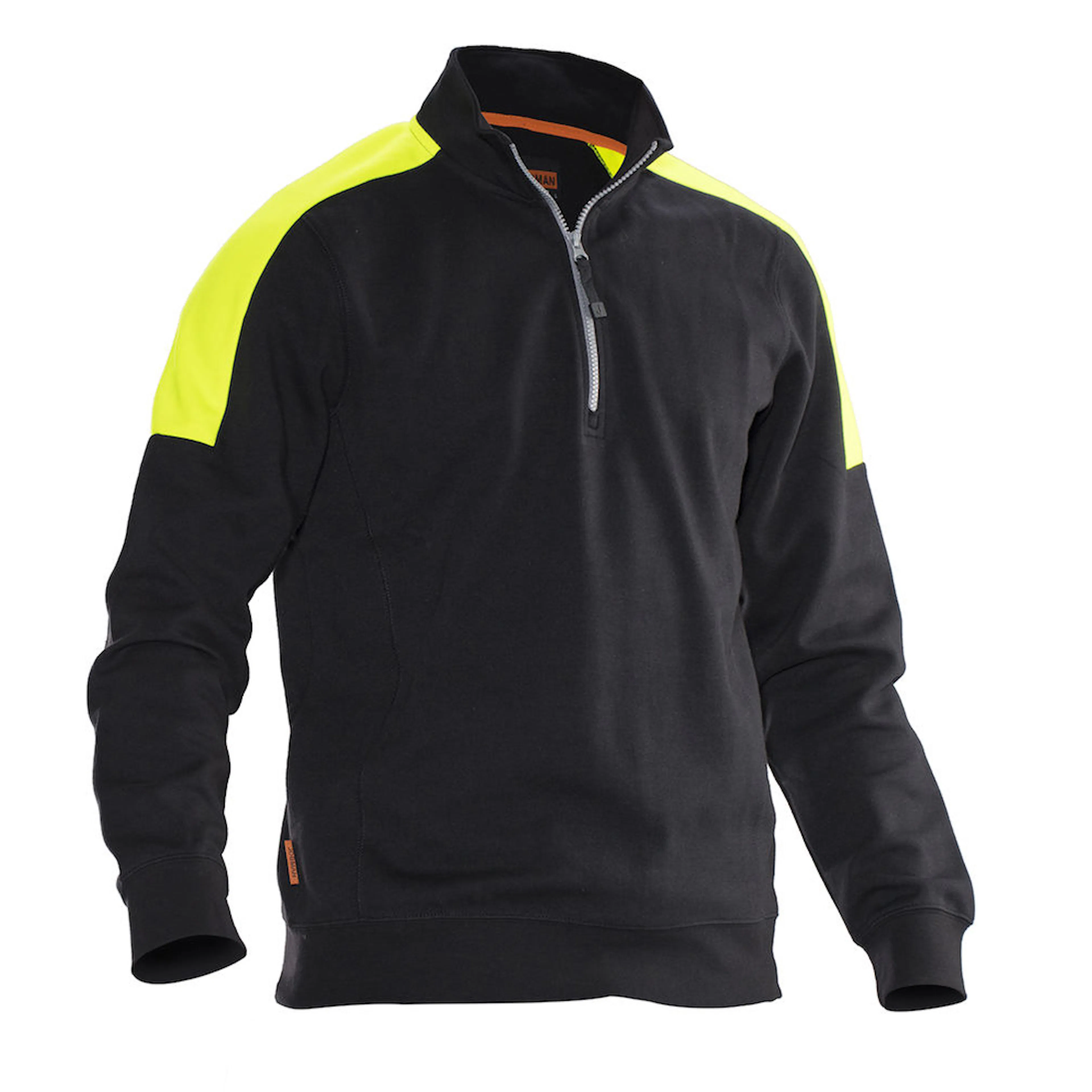 Sweatshirt i doubleface-material. Hög krage och kort blixtlås. Mudd i nederkant och ärmslut. Kontrastpanel i sidan (på den svart/gula sitter kontrasten på axlarna).