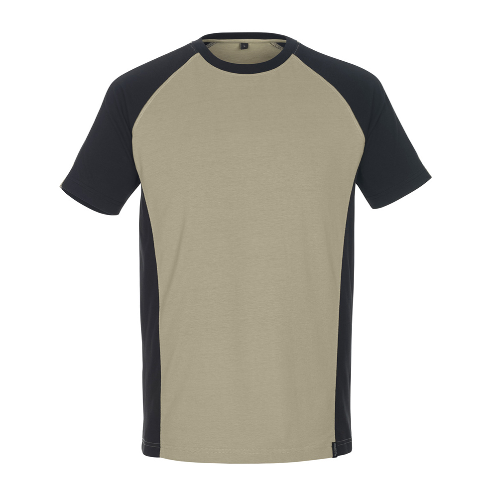 Tvåfärgat. Kammad bomull. Modern passform. Kraftig kvalitet. Förkrympt. Rund hals. Ribbstickning i halsen. Nackband.