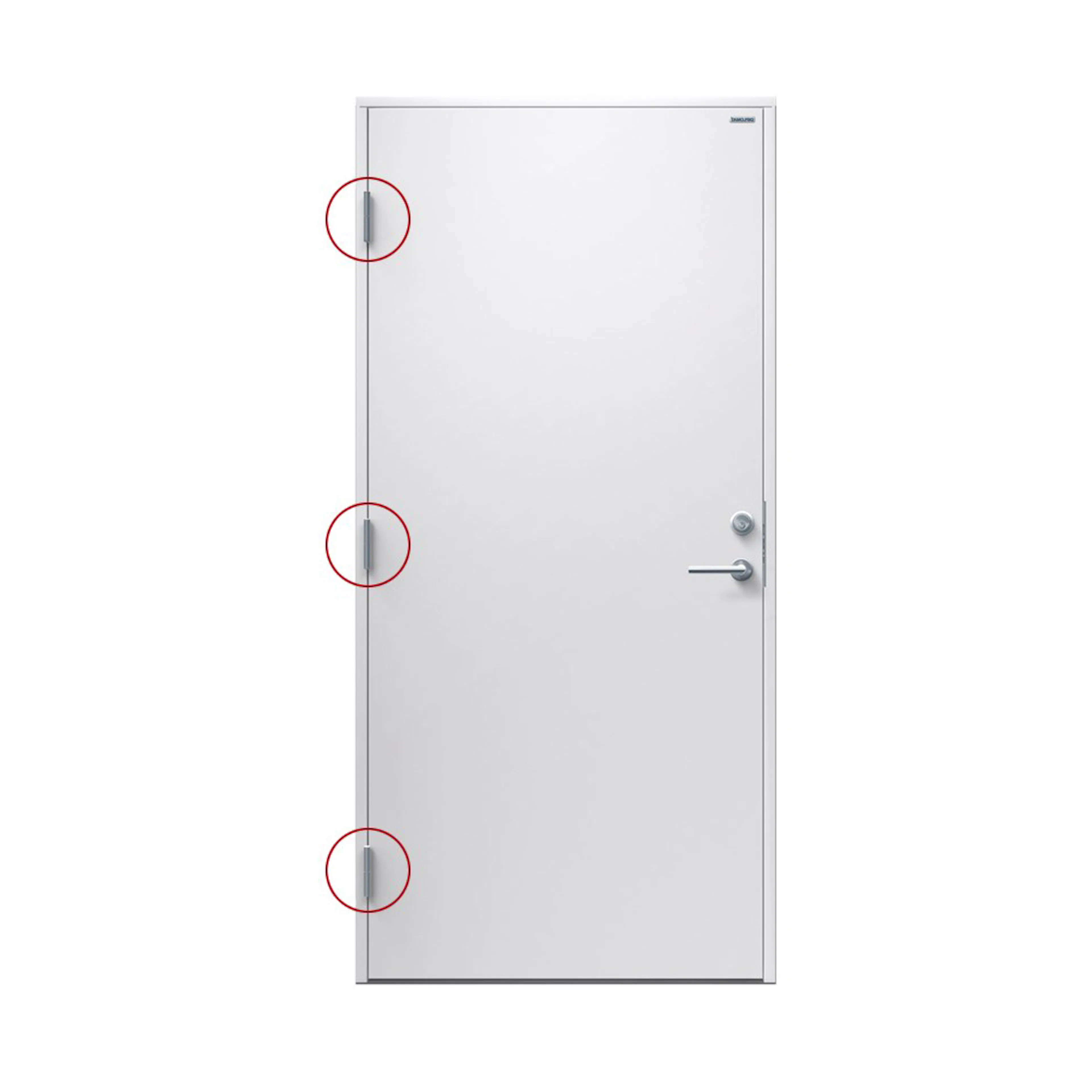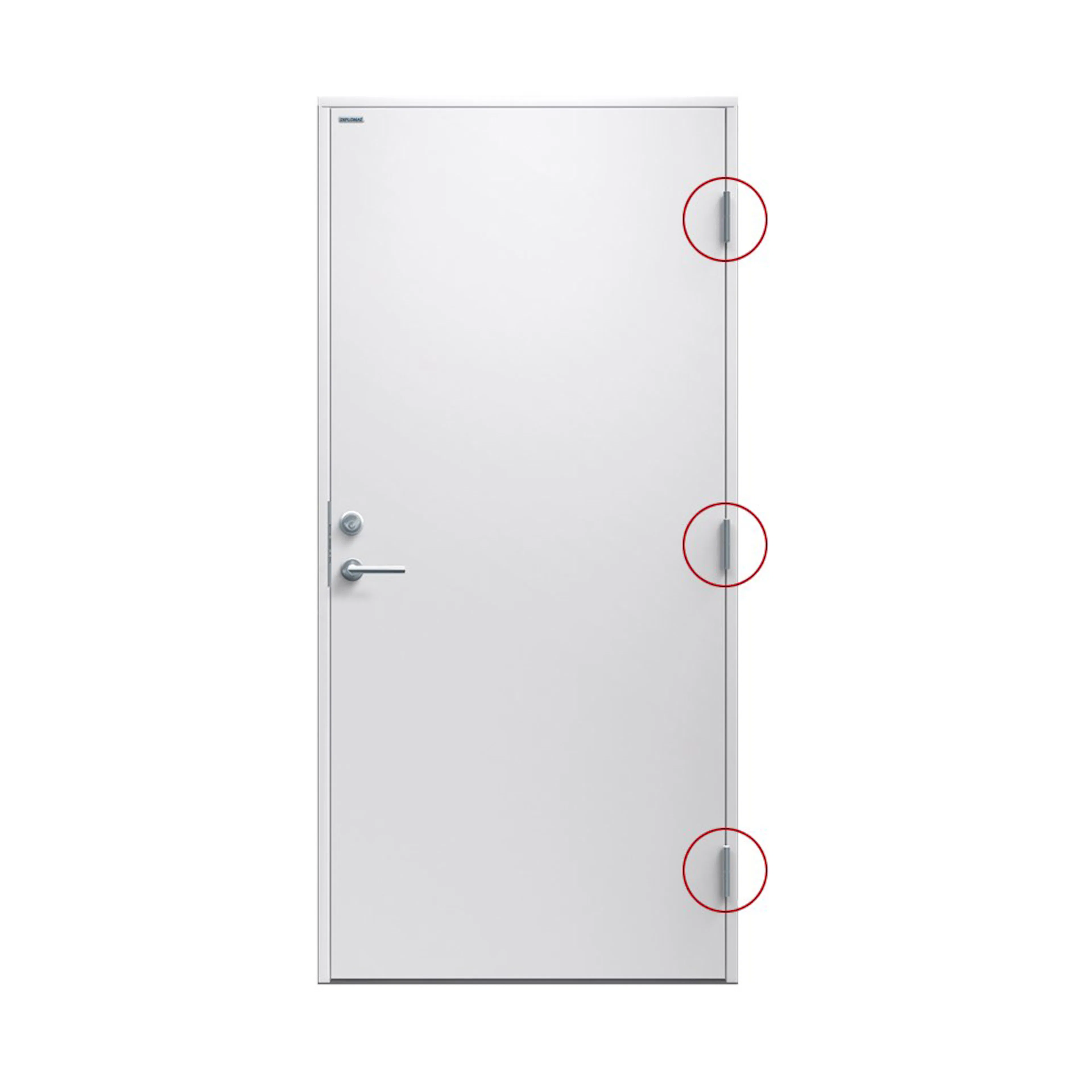 Gångjärnen är justerbara och har inbyggd bakkantssäkringsfunktion. Kraftigt säkerhetsslutbleck ASSA 1487–11 ingår också, med skruvar för finjustering av dörrbladets tätning mot karmen.
