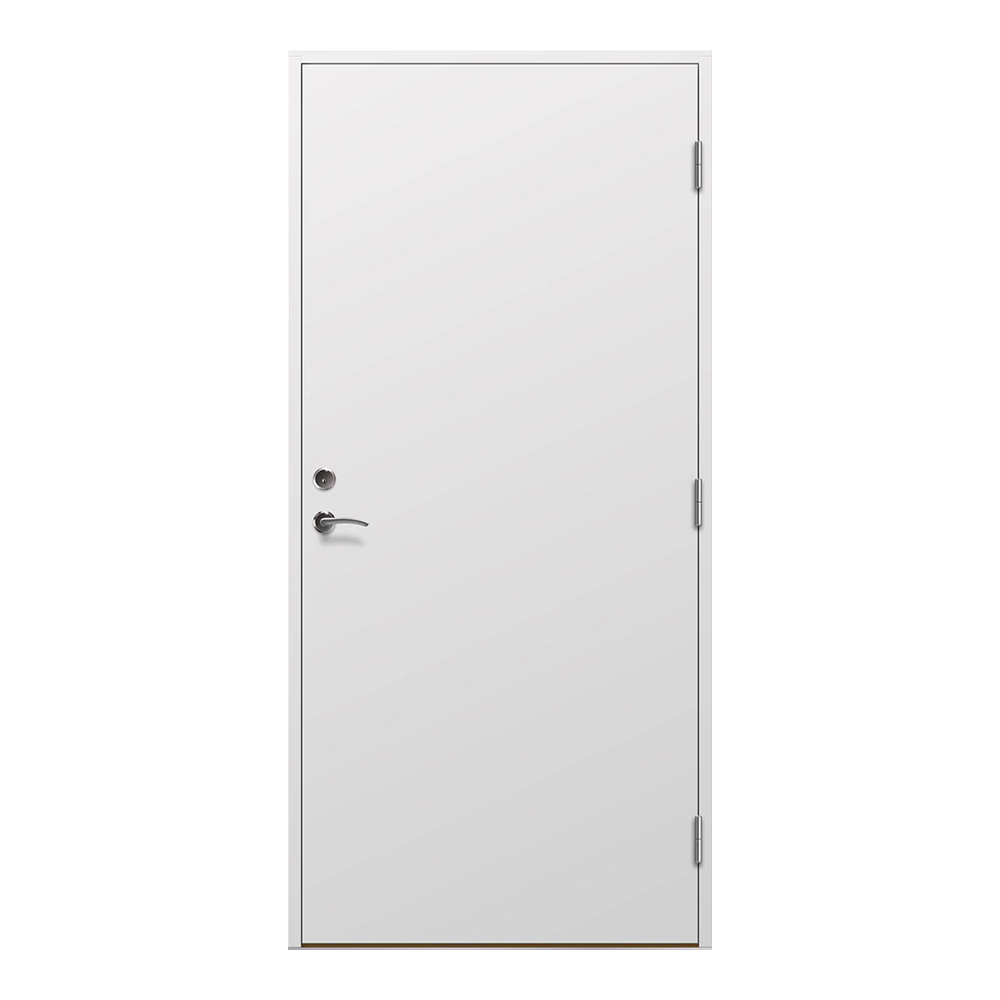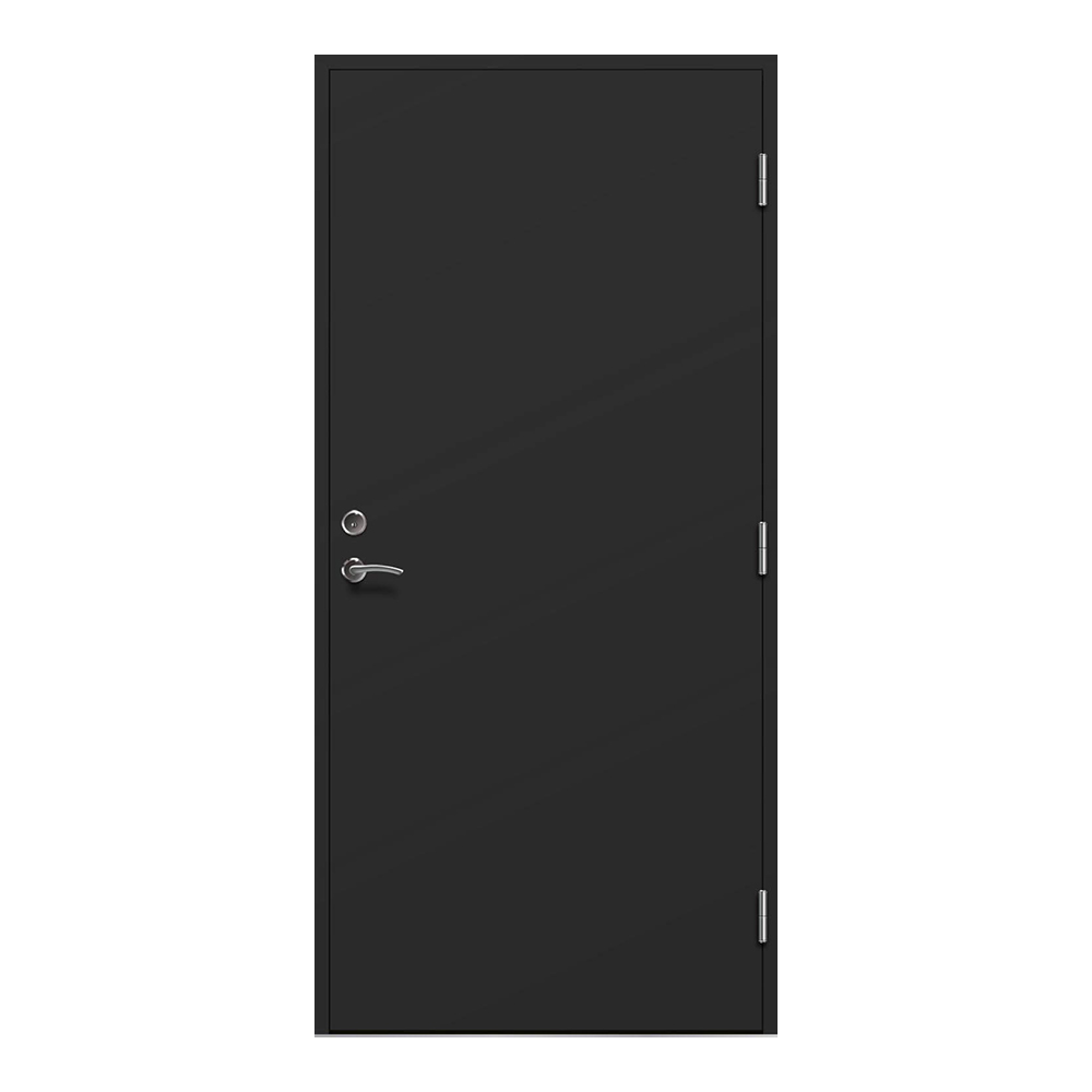 Som standard är det modulmått med avdrag 20mm för drevning. Denna dörr finns i flera kulörer Denna dörrmodell finns att tillgå i tre kulörer. Vit, mörkgrå och svart. Alla dörrar har samma kulör både invändigt och utvändigt. Önskar man andra kulörer eller dimension välj dörrar i våra övriga serier. Dörren levereras utan handtag och cylindrar som är ett tillval. ASSA låskista 8765 ingår och levereras monterad i dörren. Dörrblad levereras monterat i karm.