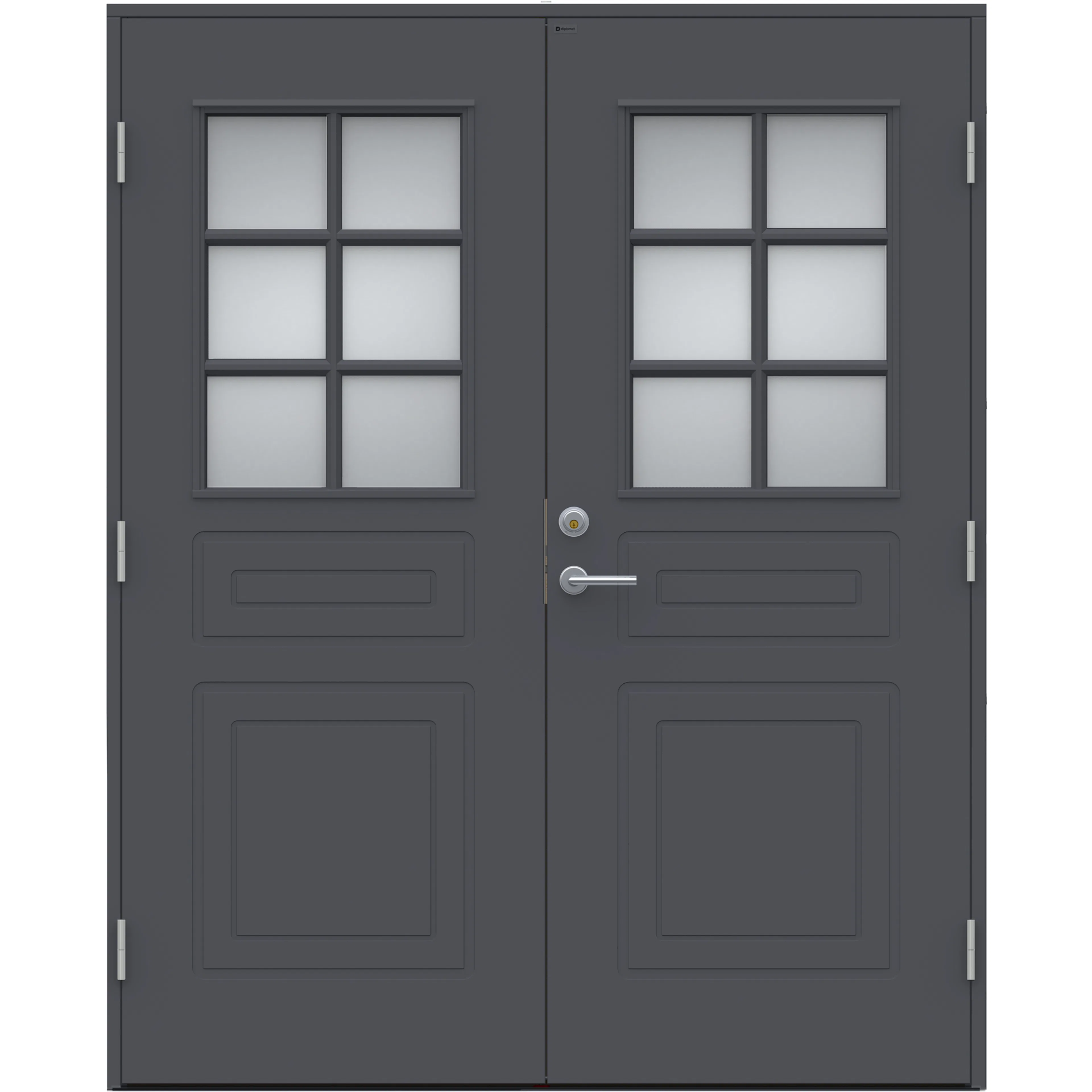 Parytterdörrar ger ett elegant intryck. Entrén blir extra bred och inbjudande när båda dörrarna slås upp på vid gavel. De flesta av Diplomats entrédörrar kan beställas som pardörrar.