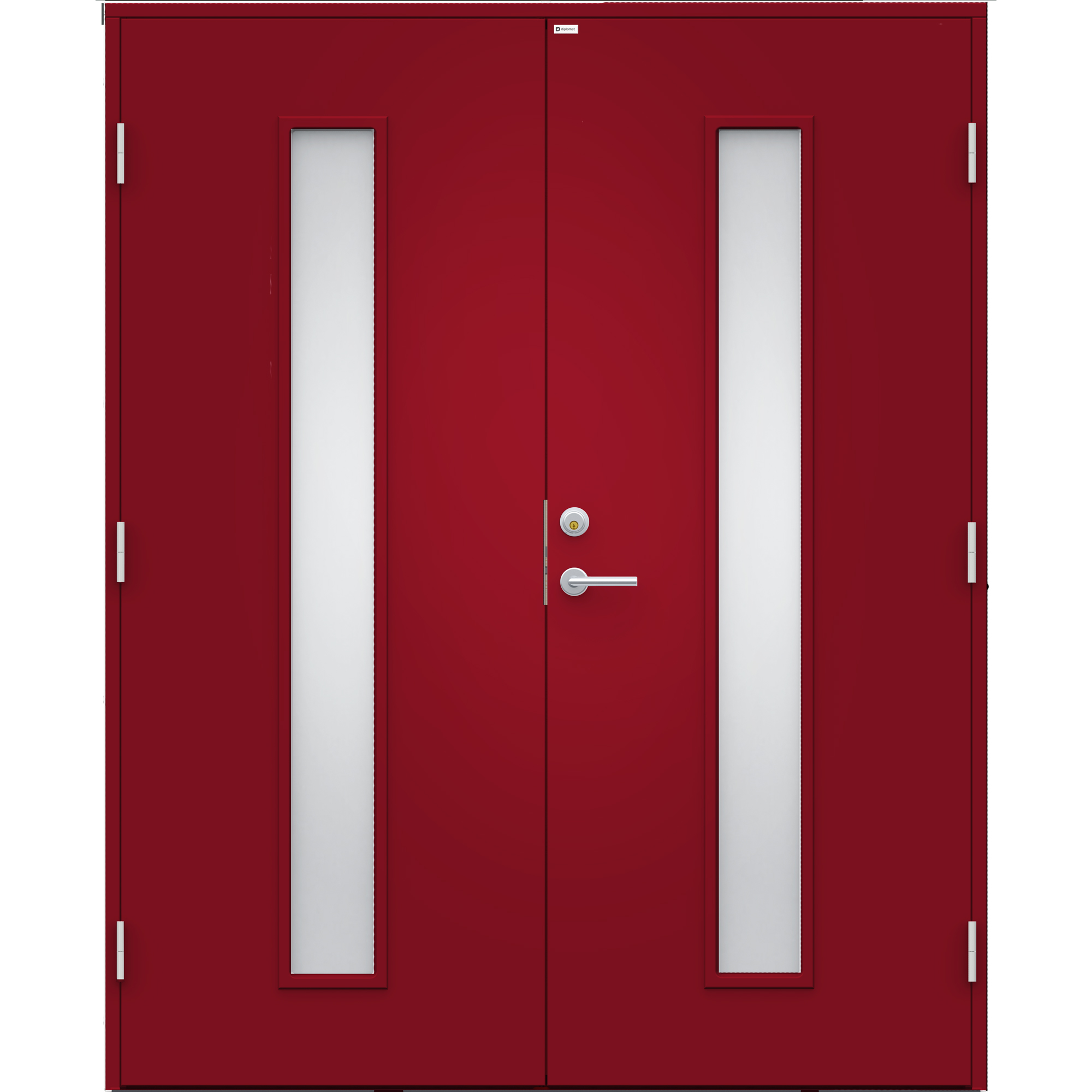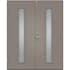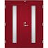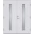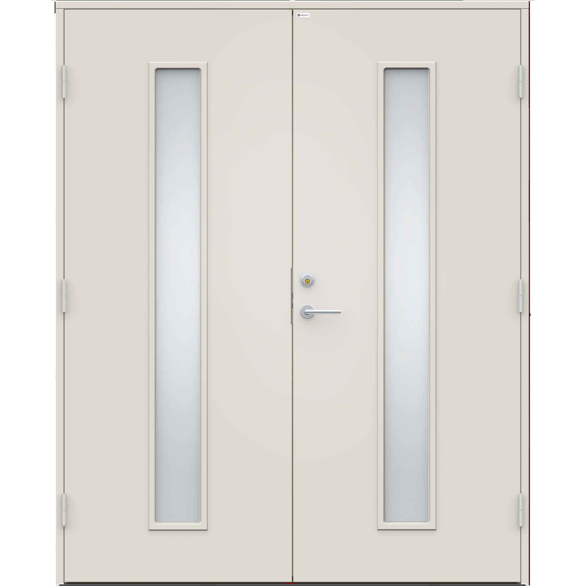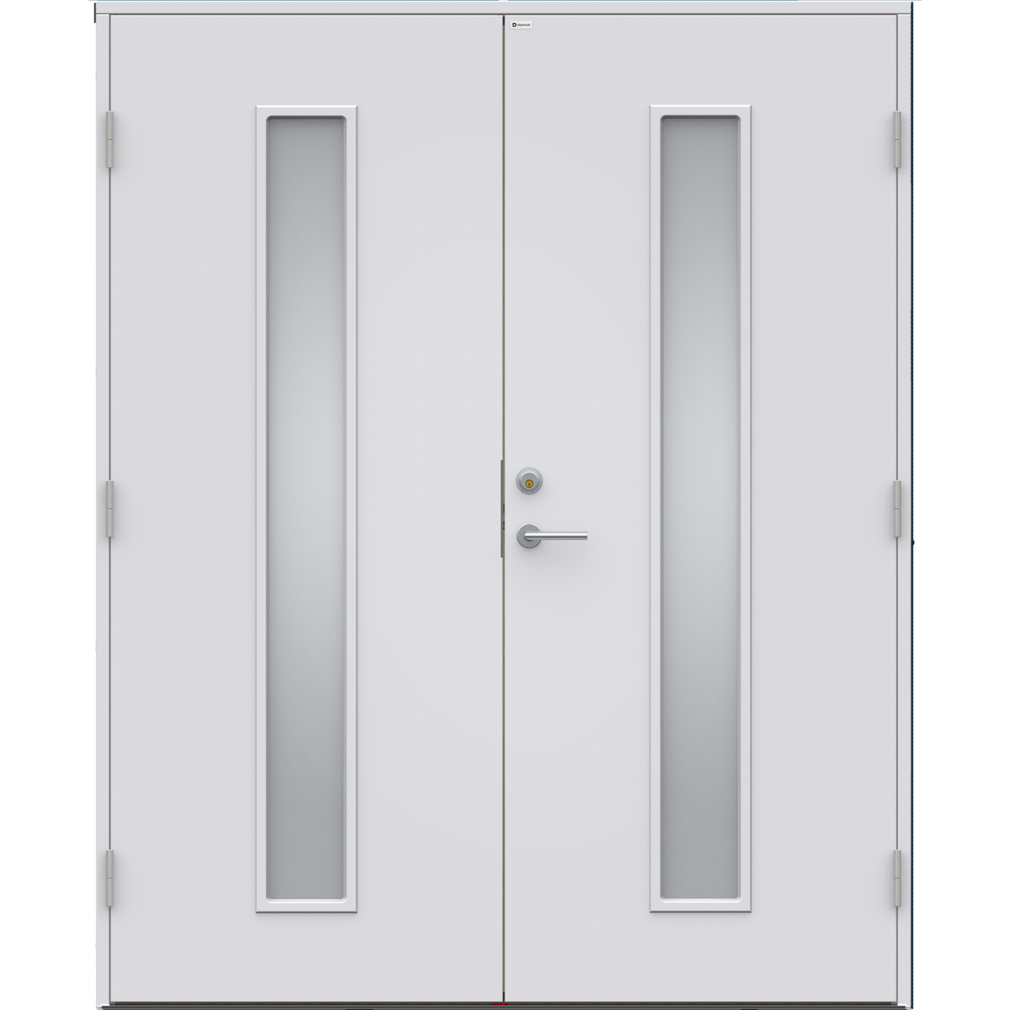 Parytterdörr i modern stil med slät yta och centrerade, stående klarglas.