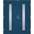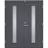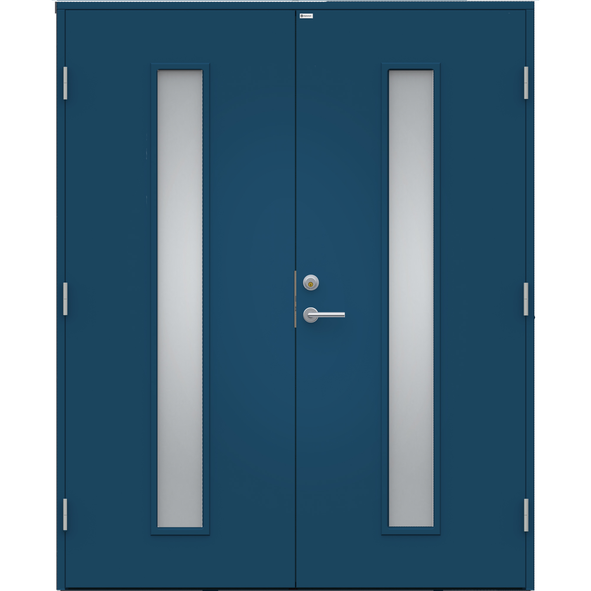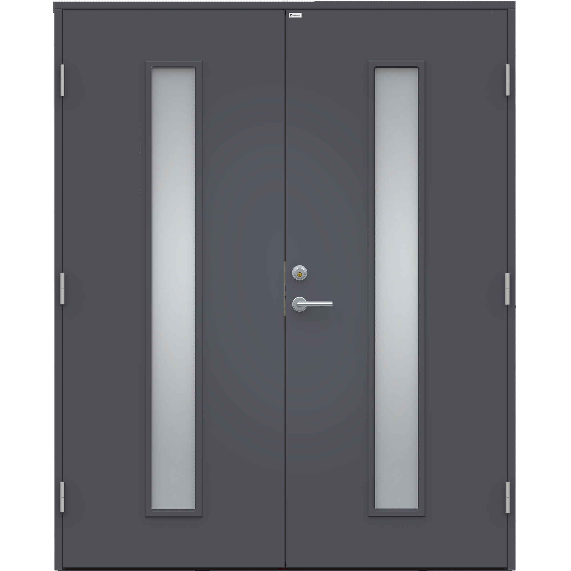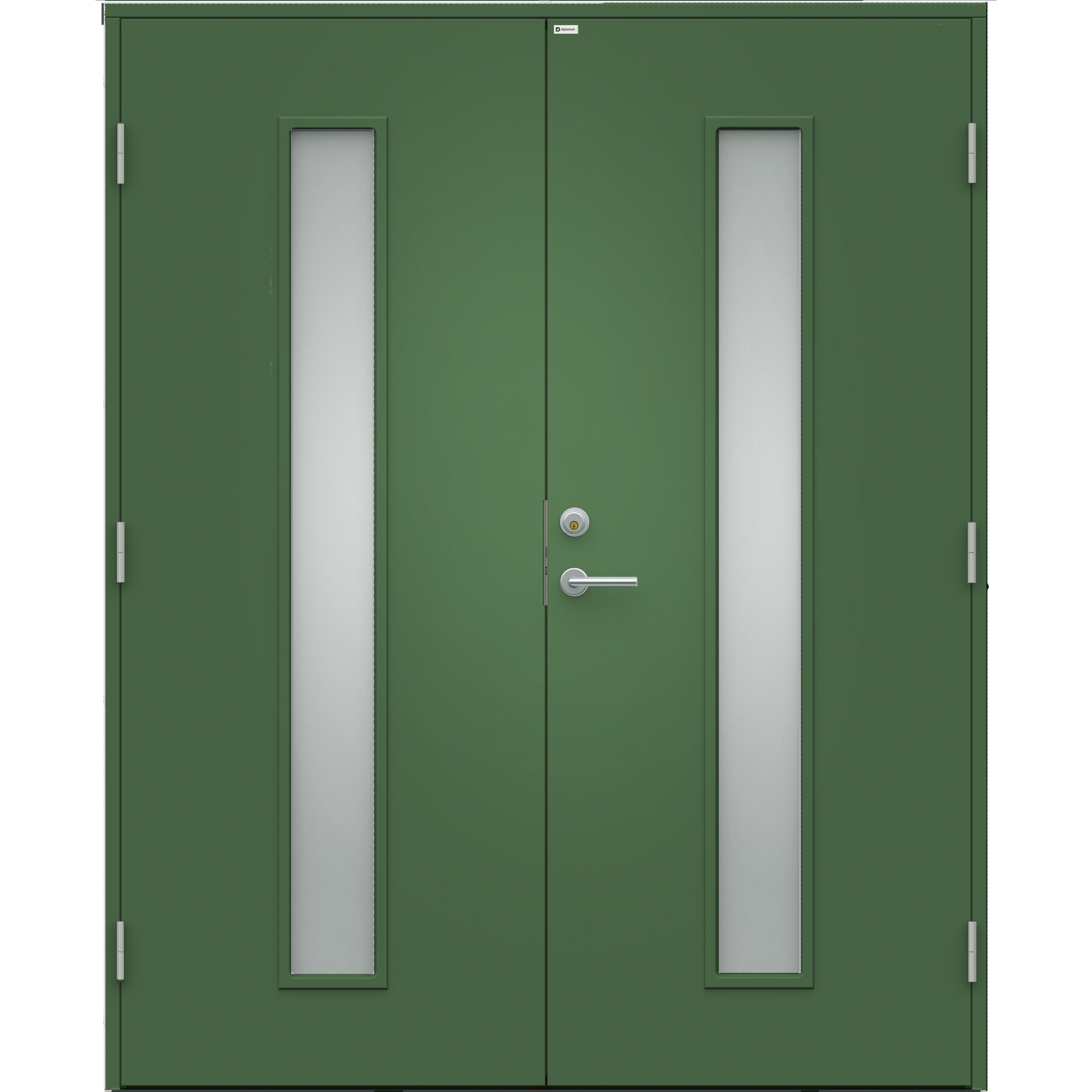 Parytterdörr i modern stil med slät yta och centrerade, stående klarglas.