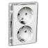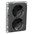 Exxact 2-vägsuttag från Schneider Electrics , låg insats. Bygghöjd ut från vägg är endast 12mm. Jordat, snabbanslutning, petskyddat för infällt montage i 1,5-modul apparatdosa. Med två neutrala överkopplingsklämmor. Kompletteras med valfri Exxact-ram.