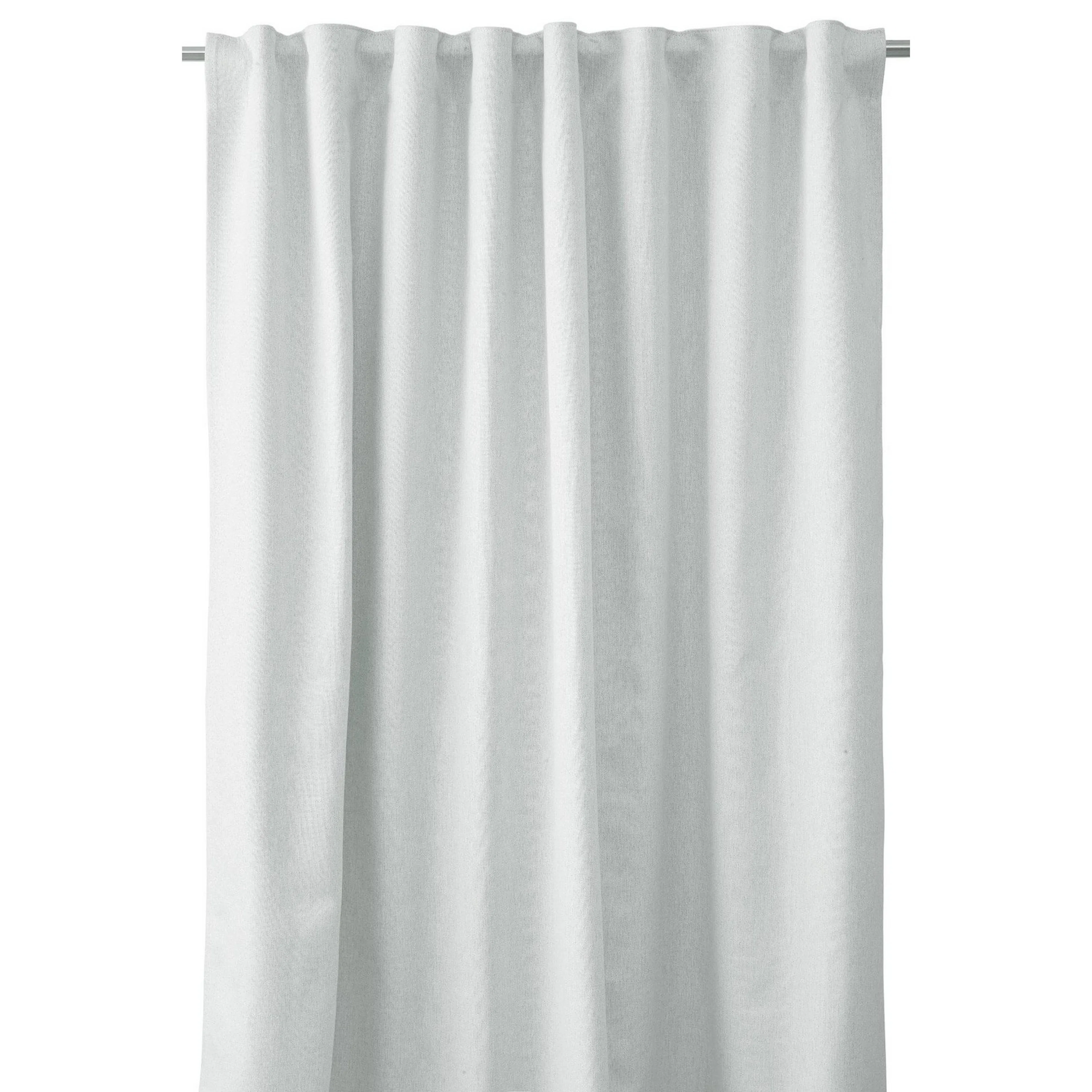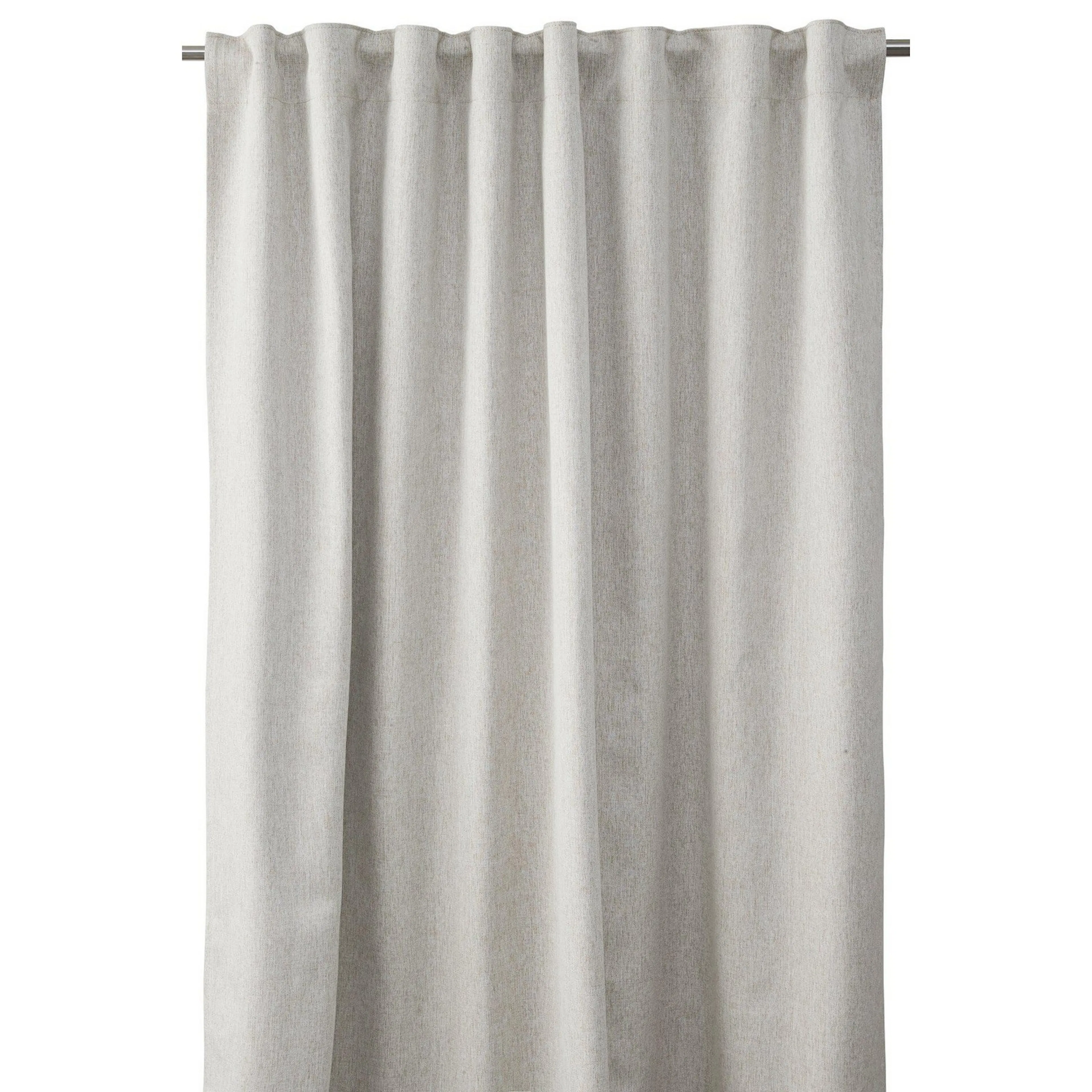 1-pack extra bred mörkläggningsgardin med multiband i ovankant, fållade långsidor och overlocksöm i nederkant. Avigsidan är ljust beige. Tyget har svarta trådar invävt i sig (som inte syns), dessa absorberar ljuset så att det inte tränger igenom.