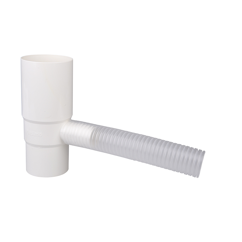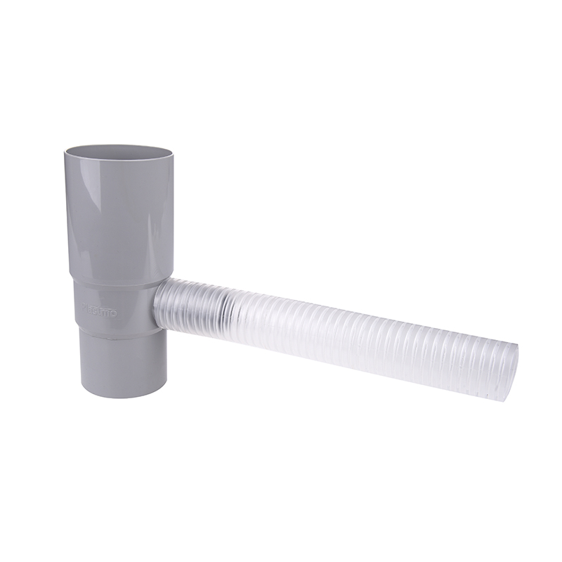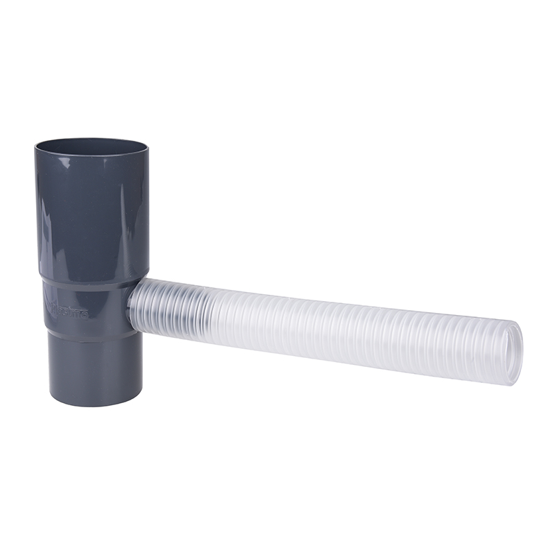 Monteras på stupröret och kopplas till en vattentunna så att vattnet kan samlas upp och återvinnas. Transparent flexrör Ø32mm med skruvgänga - längd ca. 20 cm.