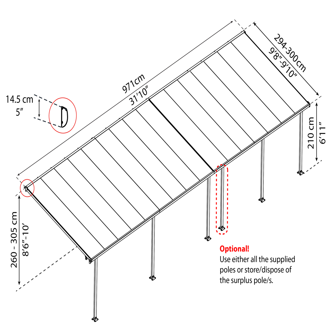 Detta Feria terrasstak består av flera tak med 295 cm djup. Den innehåller följande: 1 x 4,25 m bredd och 1 x 5,46 m bredd samt ett monteringskit till att montera de två terrasstaken. Feria kan sättas ihop på många sätt med ett monteringskit, så ett terrasstak på 295 cm kan fås i flera olika längder.