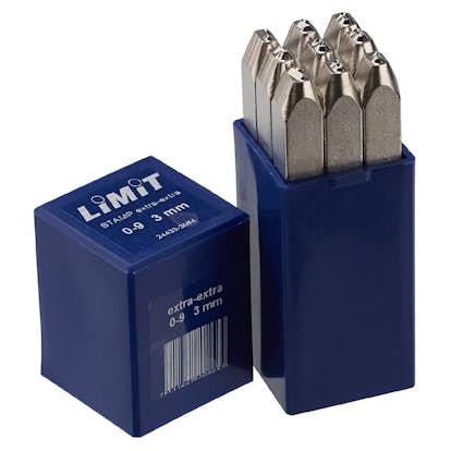 Stämplar för stål och metall. 9 sifferstämplar 0-9. För stämpling i material med draghållfastighet upp till 150 kp/mm². Lämpliga för stämpling i rostfritt stål. Nickelpläterade för att skydda mot förorening genom transferering av metallpartiklar. Packade i plastlåda.