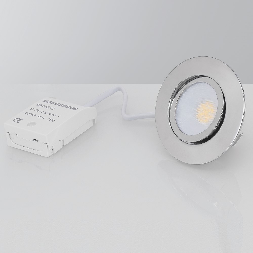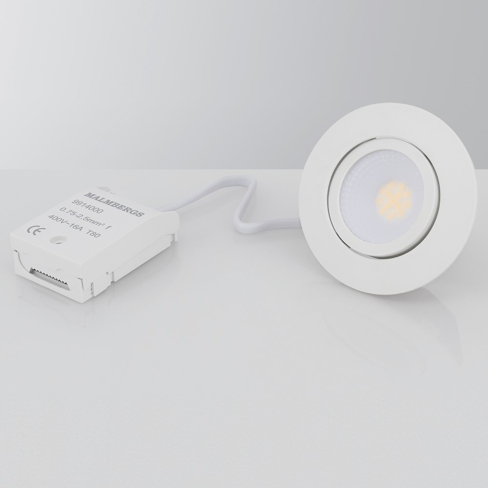 Downlight Malmbergs MD-230 är en armatur där du slipper drivdon för smidigare installation. Downlighten är anpassad för infällt montage och anslutes till snabbkopplingsplint 4x2,5 mm². Den är vidarekopplingsbar och har dragavlast för kabel eller flexslang 16 mm. Downlighten är dessutom dimbar med bakkantsstyrd transistordimmer (RC).