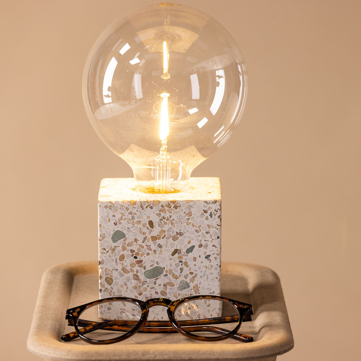 Lampa från Venture Home. Rilche är en enkel bordslampa som är helt i linje med trenderna! Lampan har en nordisk design med ett underrede i terrazzo, formad som en kub. Med sin jordnära bas skapar lampan ett varmt och lugnt intryck till rummet. Den stilrena designen gör att lampan passar i de flesta hem och inredningsstilar. Placera på byrån i hallen eller använd som fönsterlampa och du får en vacker inredningsdetalj på köpet!