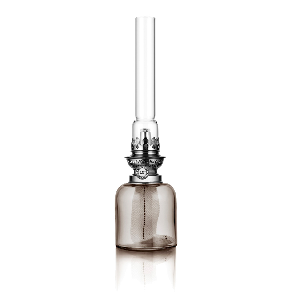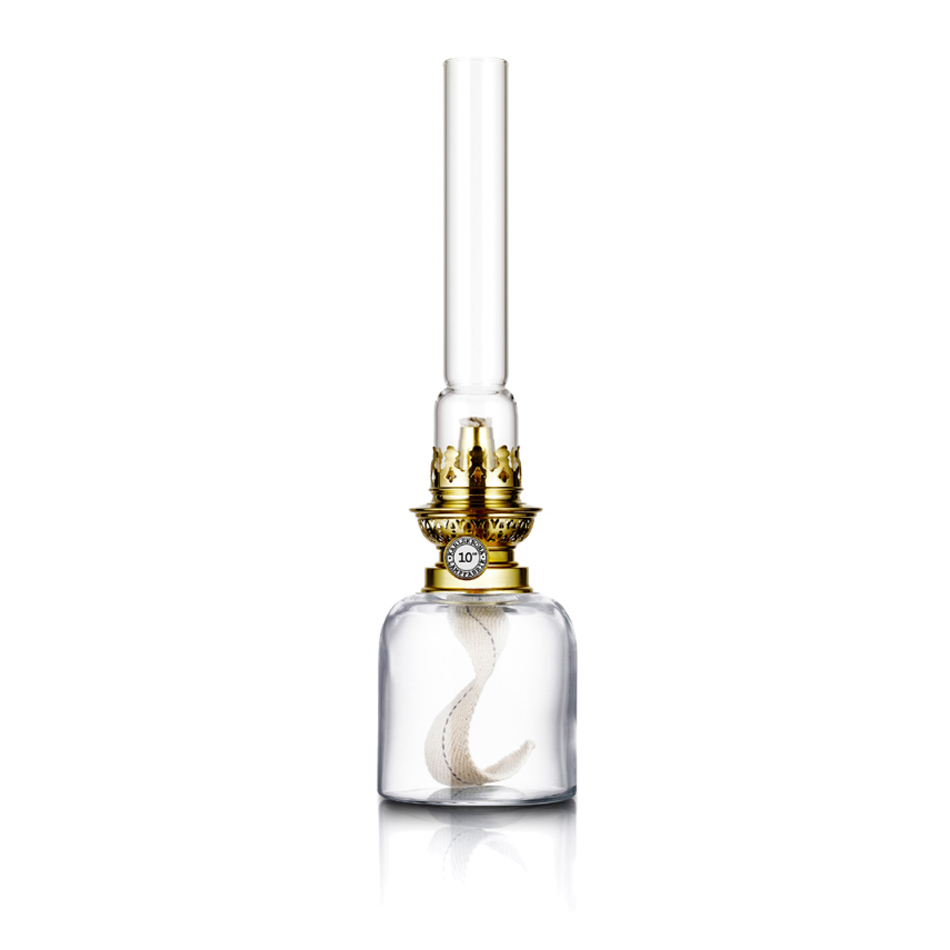 Fotogenlampa Skeppsholmen från Karlskrona Lampfabrik i munblåst glasoljehus och mässingdetaljer i trycksvarvad och dragen mässingsplåt.