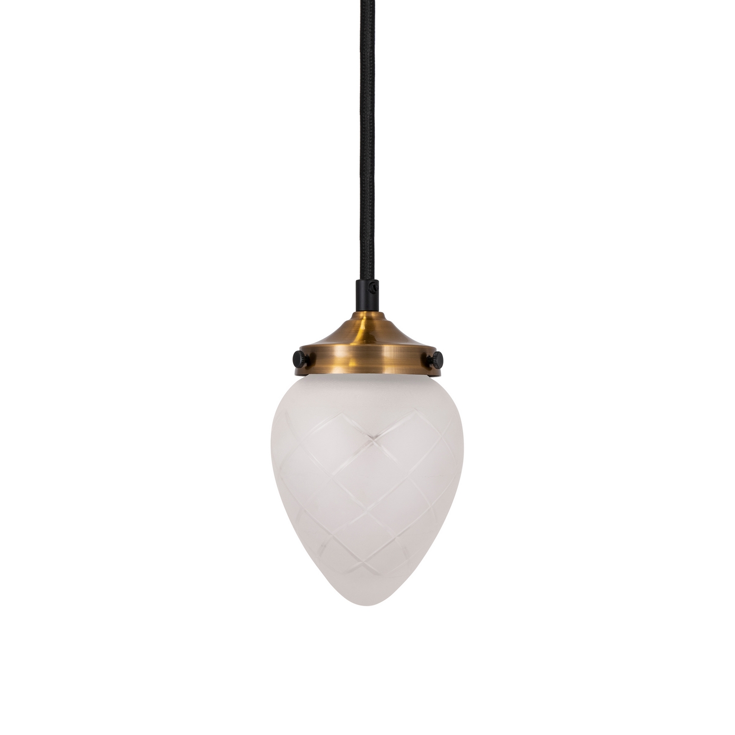 Taklampa Globen Lighting Juni Slipad med sin vackra slipade kupa i glas och borstade mässingsdetaljer i metall för tankarna tillbaka i tiden till tidigt 1900-tal. Hängande i ett fönster i en vacker hall på en herrgård, i en idyllisk svensk småstad. Eller varför inte hänga flera stycken på rad över en köksö? Lampan har en 350 cm lång svart textilkabel med brytare. Design: GL Design Studio.