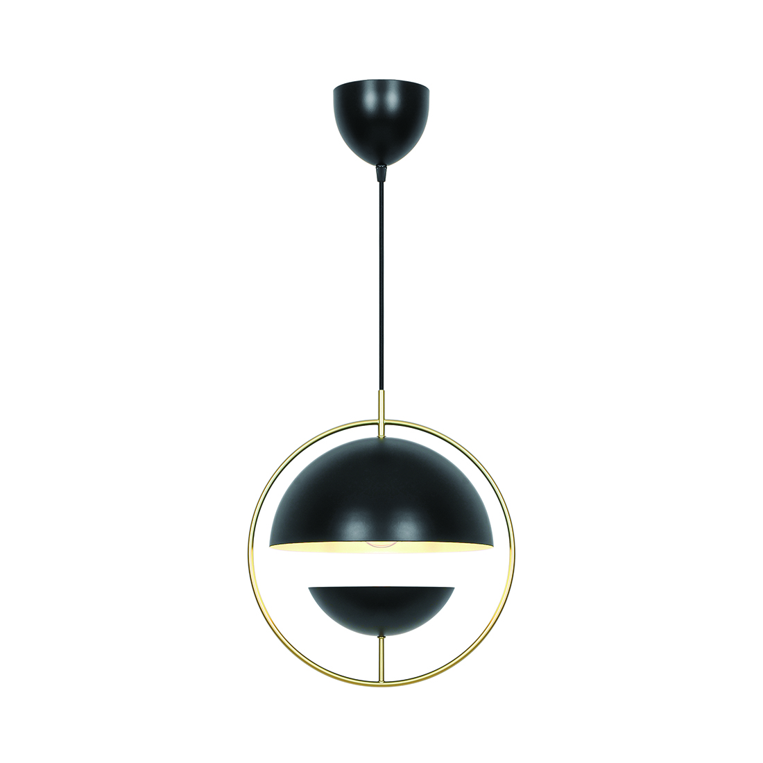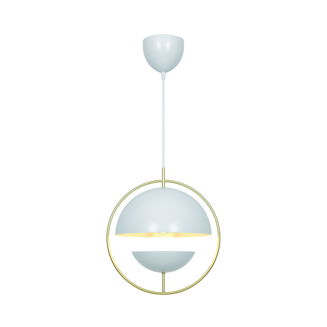 Pendellampan Tavia har en dekorativ design som är både minimalistisk och glamorös på samma gång. De två runda skärmarna är placerade mitt emot varandra med en elegant mässingsring runt. Ger ett behagligt, diffust ljus.