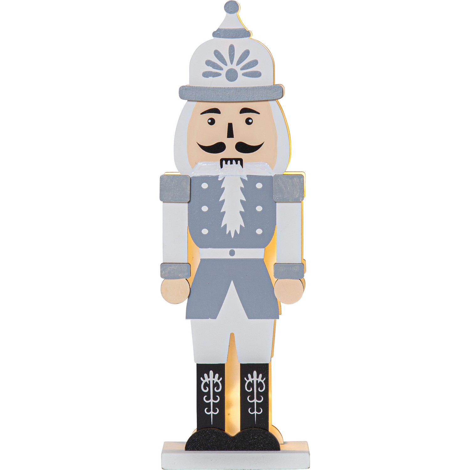 Stilig nötknäckare i laserskuren trä. Små ledlampor lyser mellan de två figursågade siluetterna, en fram och en baksida. Produkten drivs av batterier. Dekorera med nötknäckaren på en byrå eller hylla till jul och advent. Batterier ingår ej.