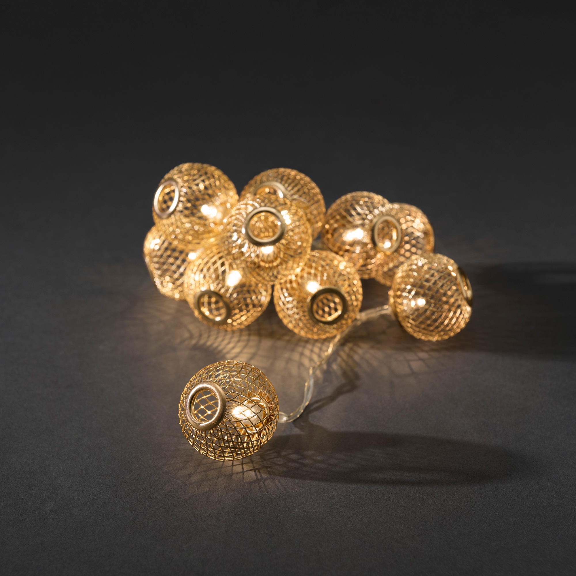 Ljusslinga från Gnosjö Konstsmide med 10 st metallbollar med varmvit LED-belysning. Drivs med 3xAA batterier. Slingan är 1,2 m lång och har en 0,3 m lång anslutningssladd till första lampan.