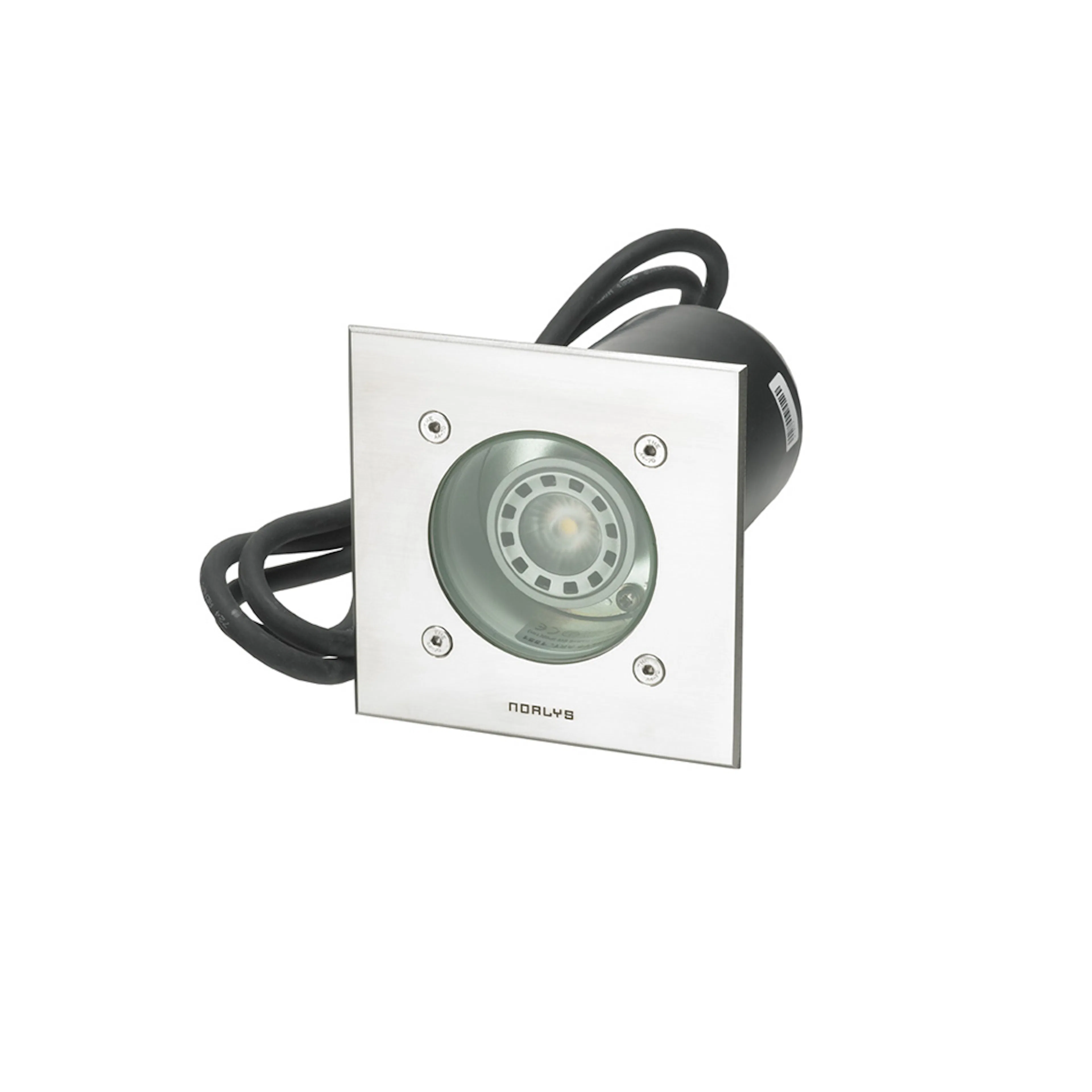 Markarmatur. Front i rostfritt stål. Klart glas. Armaturhus i aluminium. 10mm härdat glas. Fyrkantig modell. 3 meter färdigmonterad kabel medföljer. Infällningsbox i polypropylen för nedgrävning/ingjutning medföljer.