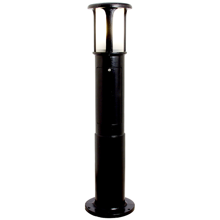 Pollararmatur med rotationsymmetrisk ljusbild. Armaturen har E27-lamphållare som är godkänd för max 75W. Pollaren har kopplingslucka och en rund fotplatta med tre bulthål. Avsedd för utomhusbruk (IP44) och passar för bruk både i privat och offentlig miljö.