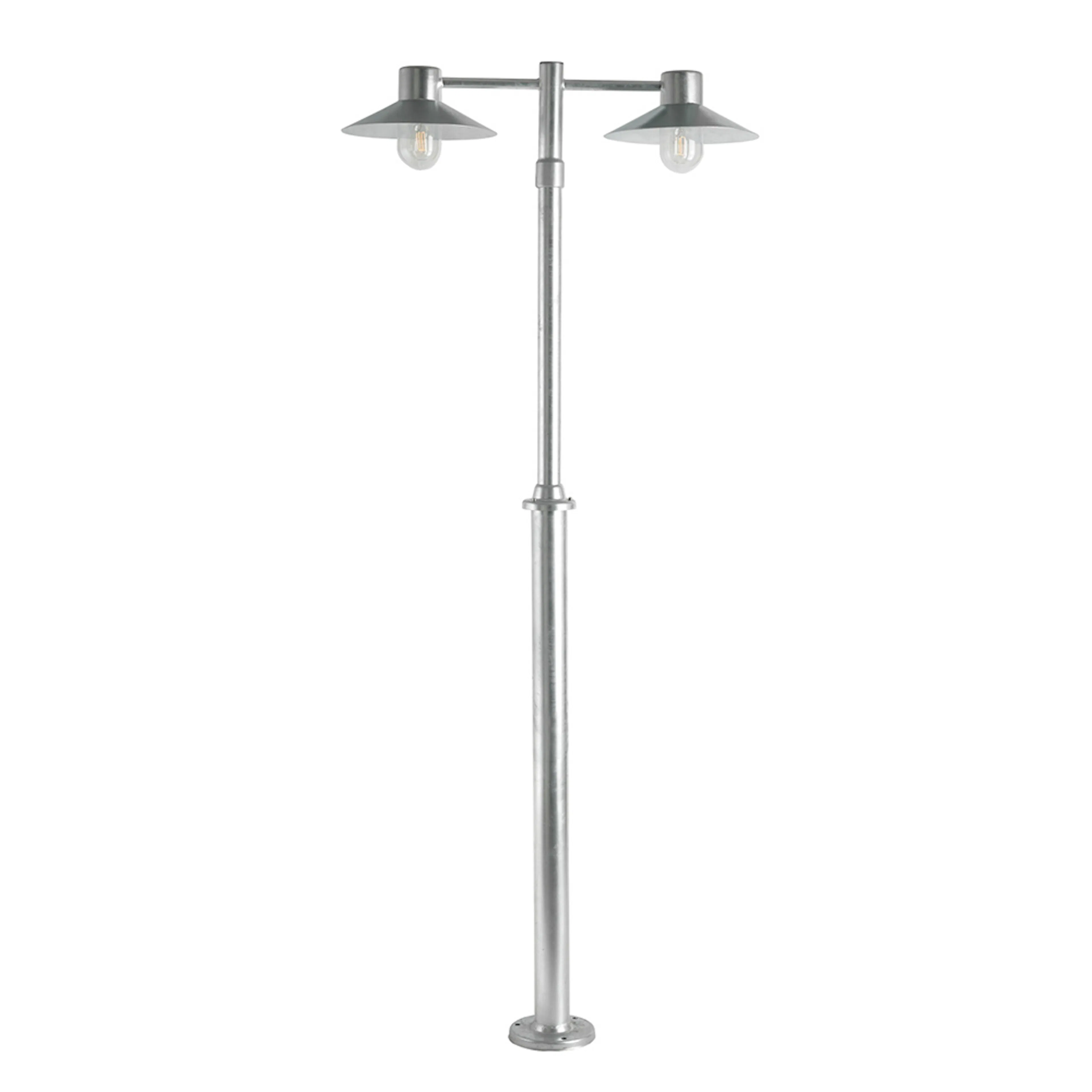 Stolparmatur i galvaniserad eller svartlackerad stålplåt. Teleskoperande. Klar polykarbonatkupa. Olika alternativ på fästanordningar finns som tillbehör. Finns även som väggmodell.
