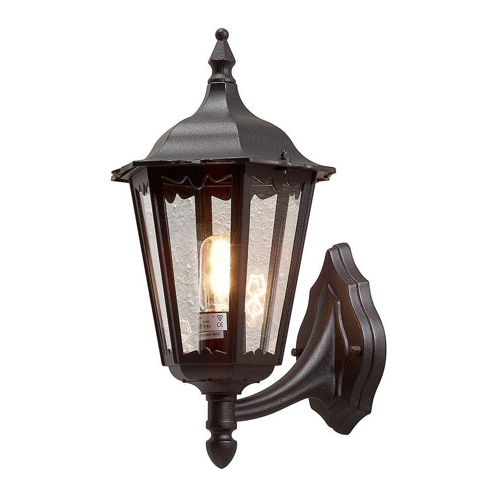 Vägglykta Gnosjö Konstsmide Firenze Upp E27 Max 100W är en elegant fasadbelysning i form av en klassisk lykta. Den har klart glas och levereras utan ljuskälla.