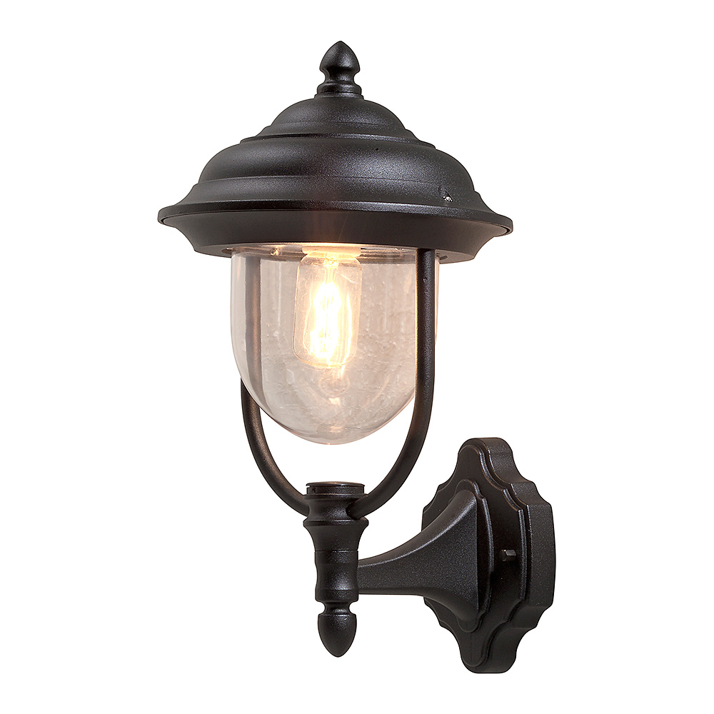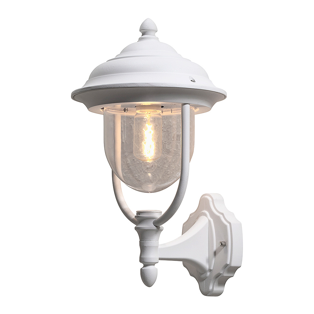 Vägglykta Gnosjö Konstsmide Parma Upp E27 är en stilren fasadbelysning i form av en klassisk lykta med en kupa i klart akrylglas. Den levereras utan ljuskälla.
