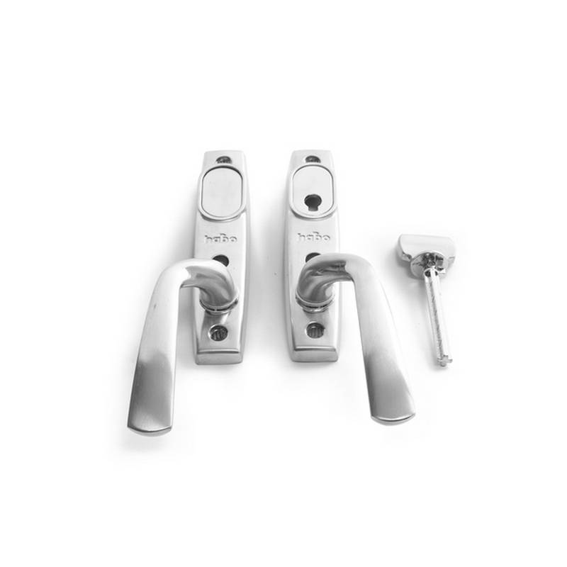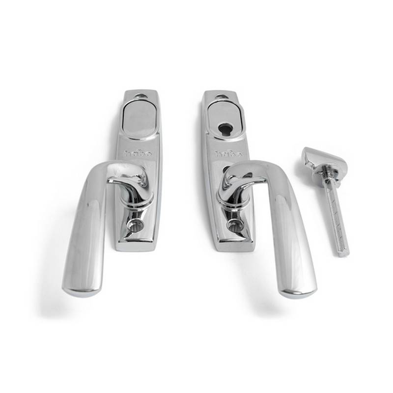 Fönsterhandtagssats av zink, inklusive långskylt. Vändbart. För dörrtjocklek 53-78 mm. Komplett sats med invändigt cylindervred, utvändig Täckbricka, 5x100 mm tryckeskruv och 8x90/100/110 roddarpinne. Vid behov kan cylindervredet monteras med "bortafunktion". Kan även monteras med ovalcylinder för spanjolett. Använd alltid längsta möjliga roddarpin ne vid montering! Pinnen ska nå hela vägen in i handtagen på båda sidor.