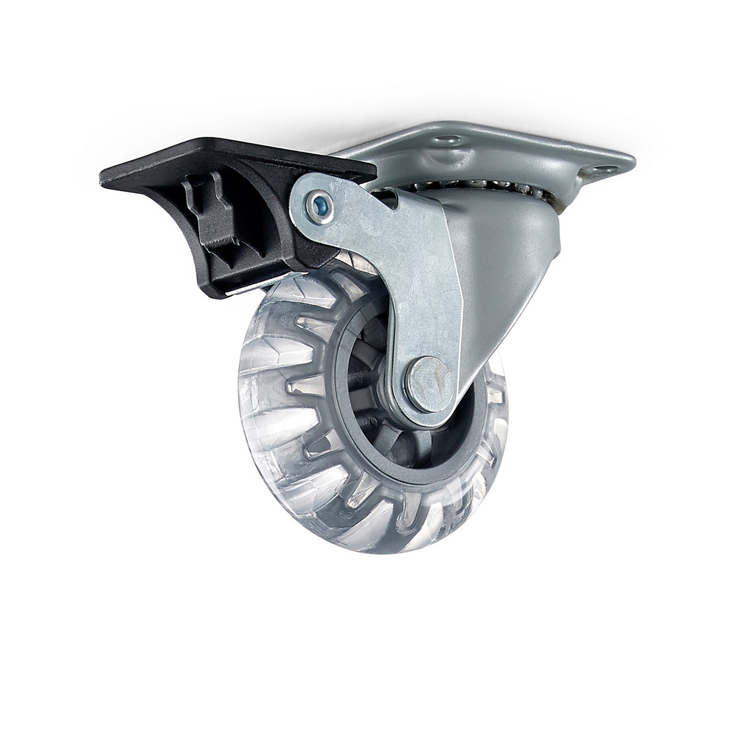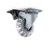 Svängbart möbelhjul av stål med platta och hjulbroms. Hjul Ø 50 mm av transparent polyuretan (PUR). Fästplatta 42x42 mm. Maxbelastning 40 kg per hjul (beräknat värde, garanteras inte).