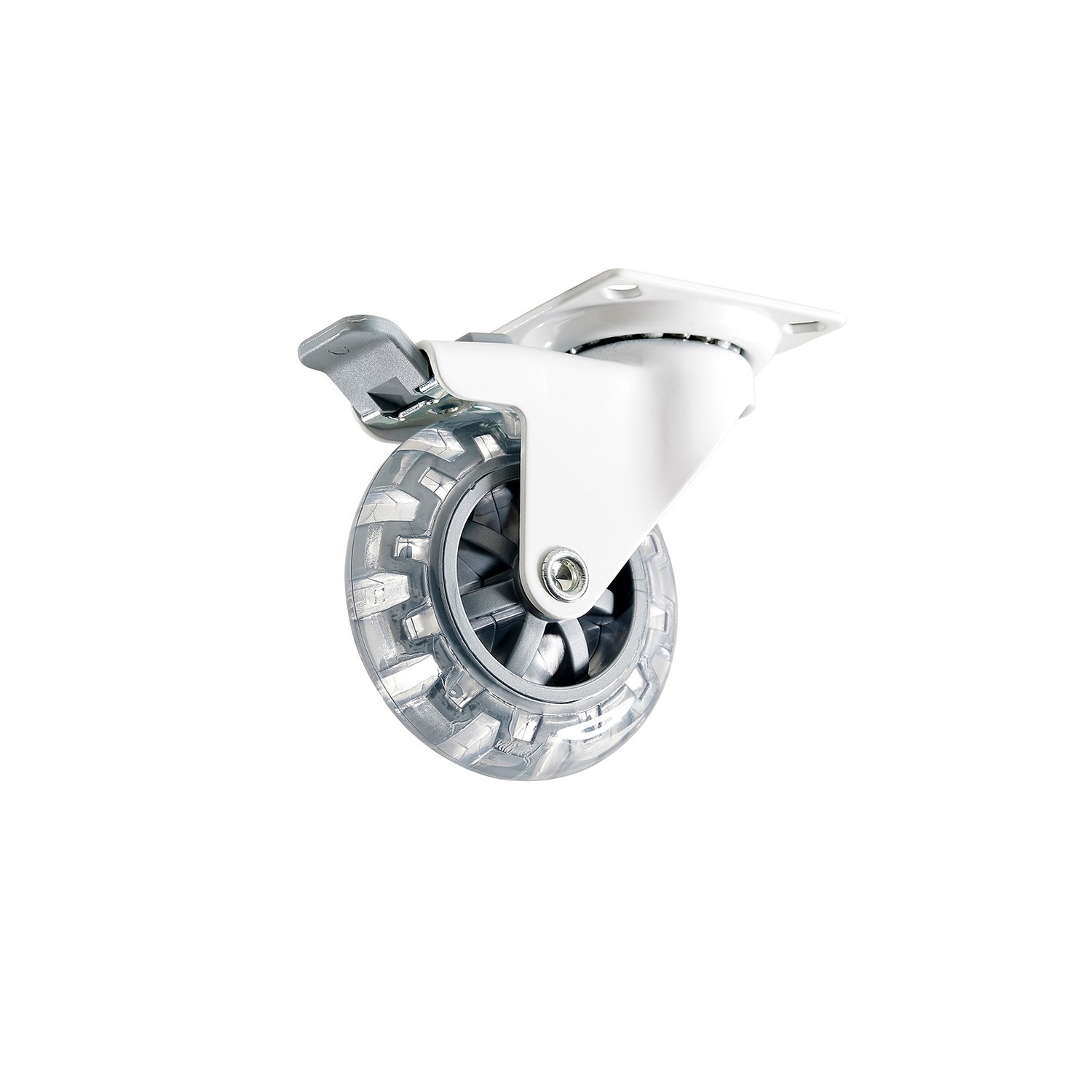 Svängbart möbelhjul av stål med platta och hjulbroms. Hjul Ø75 mm av transparent polyuretan (PUR). Fästplatta 60x60 mm. Maxbelastning 55 kg per hjul (beräknat värde, garanteras inte).