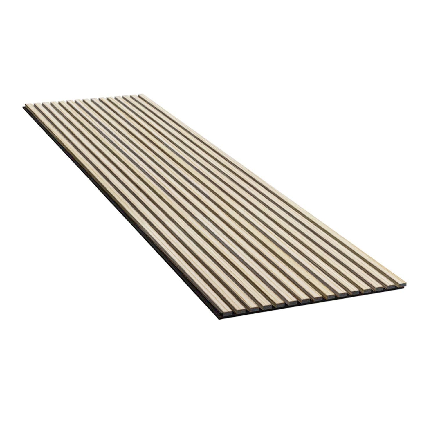 Vacker och funktionell akustisk inredningspanel med träfaneryta 27 mm lameller, nyans grå ek. Paketet innehåller 1 st 2400x600 mm akustikskiva och monteringsskruvar.