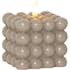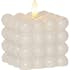 Flamme Dot är ett fyrkantigt ljus gjord av vit vax med en bubblig yta. Ljuset är cirka 8,5x9,5 cm inklusive lågan.
