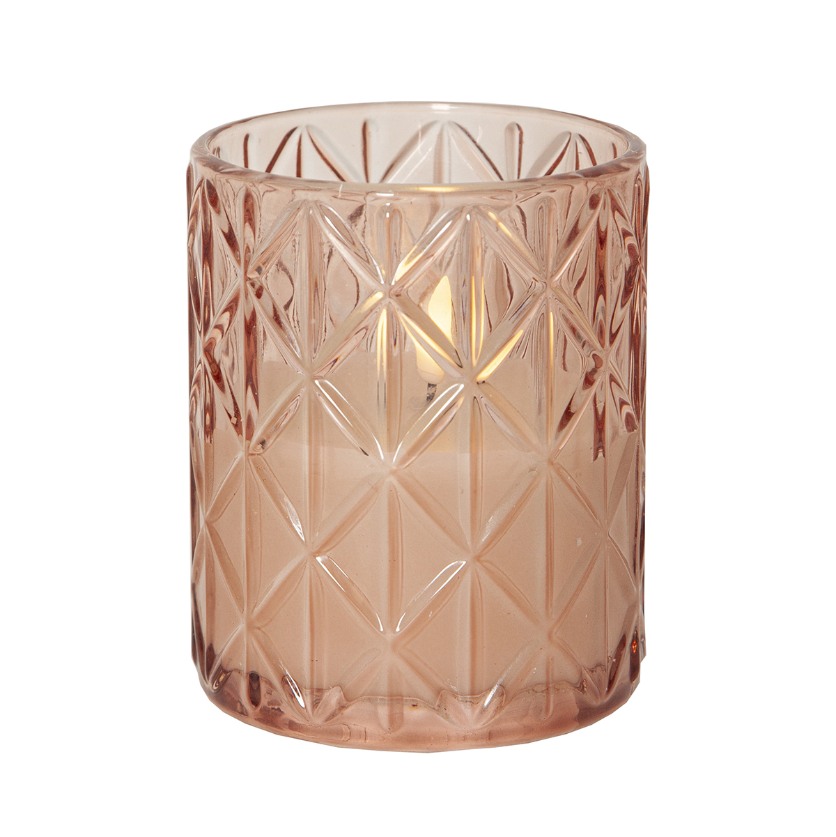 Flamme Romb är en glaslykta med batteriljus med rombformat mönster runt vaxljuset.